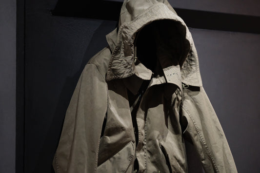 AZUREA SALVIA 2025 ORDER EVENT " CLYFFORD STILL " 11/22-11/24 (東京)11/29-11/30 (大阪) - ATELIER COAT. テーラードジャケットの上から着るアトリエコートというリクエストに対してリサーチを重ねたところショールカラーのアトリエコートの写真を発見した。テーラードジャケットの上から似たようなテーラードカラーのアトリエコートを合わせるスタイリングよりもショールカラーという新たな選択肢を形にしたいと考え今回挑戦した。箱ポケットや打掛けボタンの仕様は古い日本のコートを参考にしてアレンジを加えました。特に箱ポケットの形や数本のステッチを入れる手法はメジャーな箱ポケットの概念を良い意味で覆された。サイズ感は全体的にゆったりとしていて肩の位置もかなり落ちているデザイン。打ち合いもやや深めにしてコート感を出している。 - JACKET. 3種類の昔の日本のジャケットのディテールを組み合わせたデザイン。大き目の上襟は海軍から、前身頃のポケットは白いリネンのジャケット①、内ポケットは白いリネンのジャケット②を参考にした。しかしながら襟のバランスやポケットの形、縫い代の処理などをそのまま写したわけではない。コートもまた然りだが、きっかけとして惹かれる古い服があるのであってそれをそのまま作る意味を見出せない。自分だったらこう作りたいという意図があるからこそ形にしているのだ。敬意をもってその先を作り出したい。そんな想いで縫った2着です。 -SHIRTS. 詳細不明のウールのシャツの写真を見つけた。前脇の裾はカーブしていて、後ろはストレート。嗚呼、自由でいいんだなと教えてもらった気がして直ぐに形にしようと思った。その衝動で作ったシャツ。この裾のカッティングに合うサイズ感、襟、カフスを考え型紙を書いていった。先ずサイズ感はややゆったり目。前襟ぐりの下がりを少し深くすることでリラックスした首周りの見た目を狙った。それに対して襟先をシャープ気味にし、引き締まった襟の印象を演出することで緊張と緩和のバランス(曲線と直線の関係性)を整えた。ヨーク仕様ではなく背幅を大きく設定することで運動量を補い、裏にヨークのような裏地を当てることで補強と肩の縫い代を隠す役割を果たしている。このシャツは生地によってステッチや縫い代の始末が大きく変わるので、奥行きのあるデザインを表現することが可能だと実証出来た。