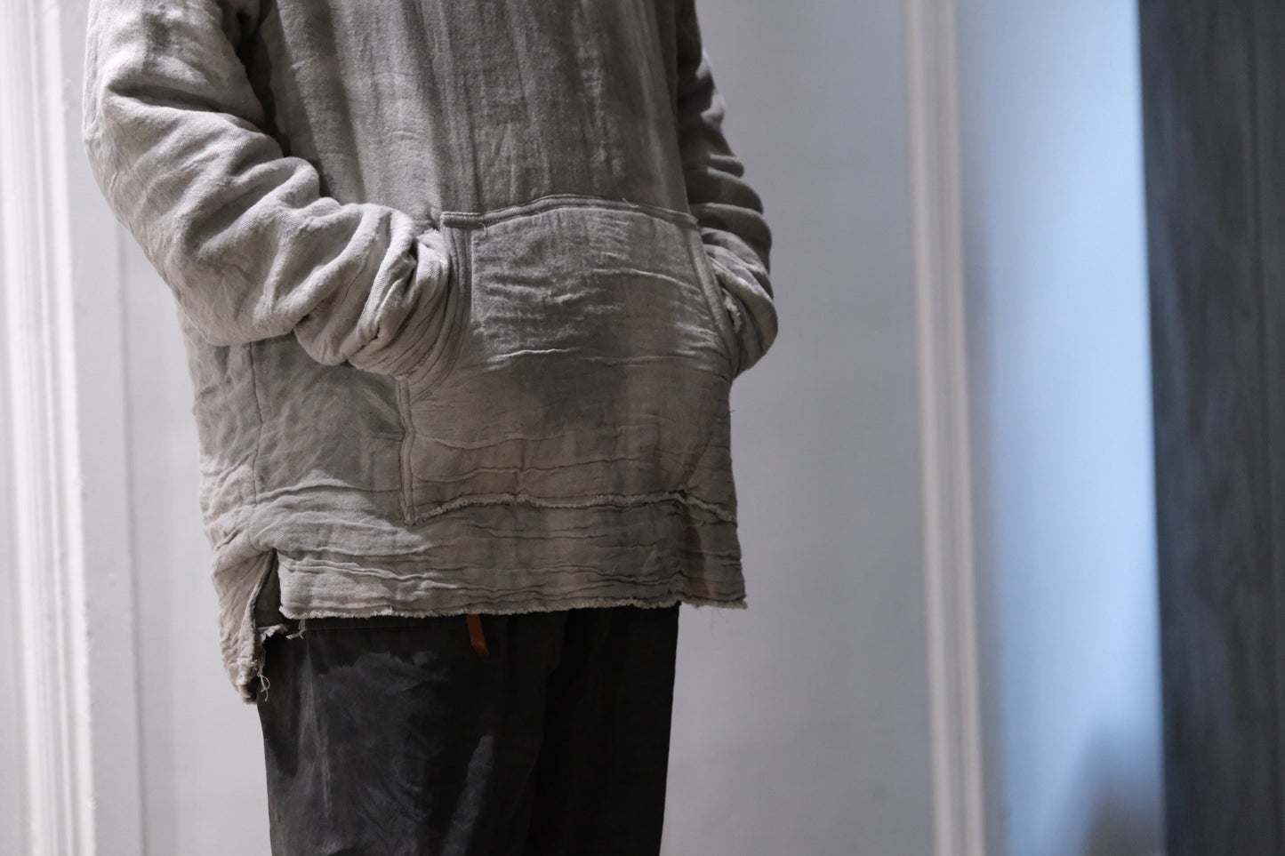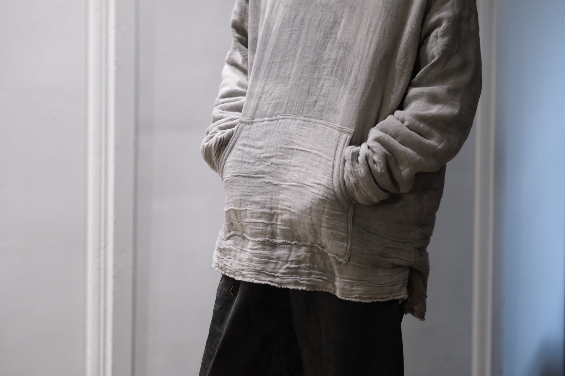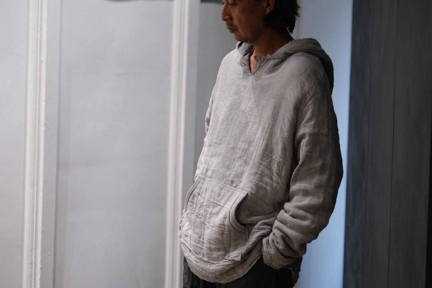 4重織のコットンガーゼ生地に、裏地にオーガニックコットンのダブルガーゼをライニングし、合計で6重織の厚みを作ったパーカー。スウェットの代わりになるような生地を表現したくトライしました。スウェットパーカーの替わり。独特の反発性が生地にあります。またムラ感が出るように製品で墨染を行っております。