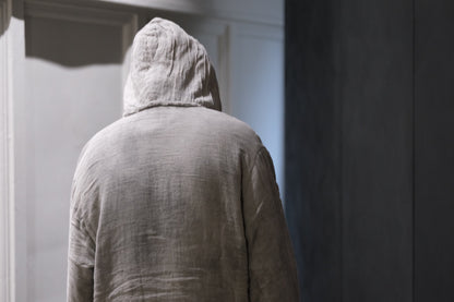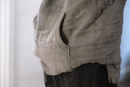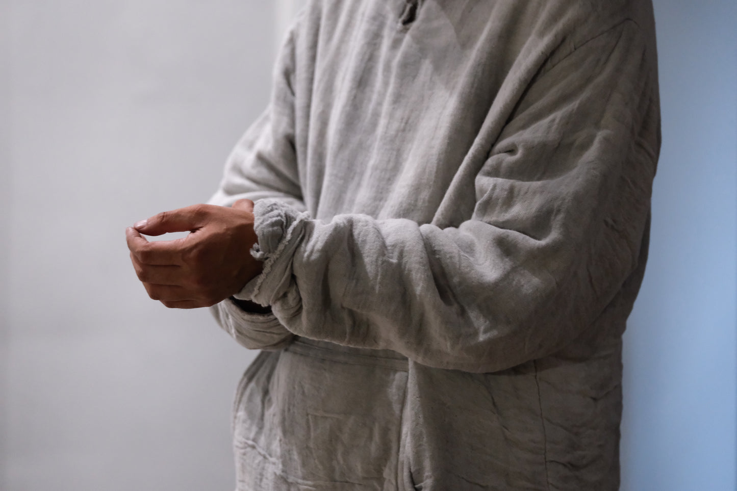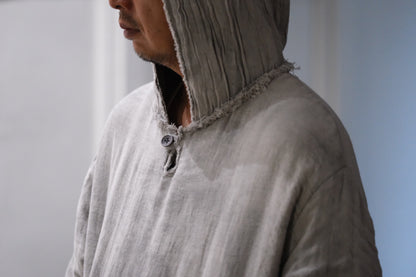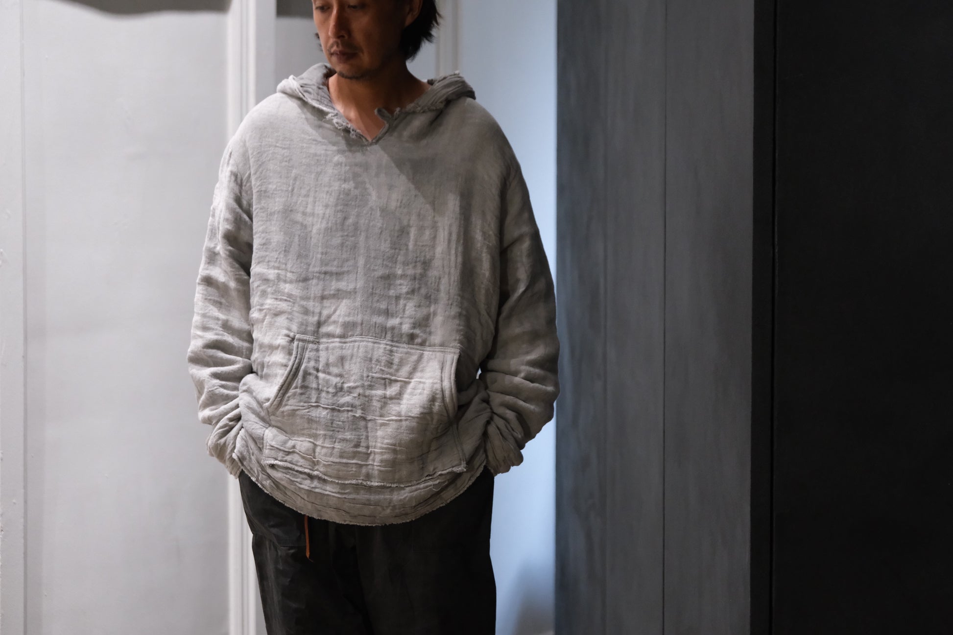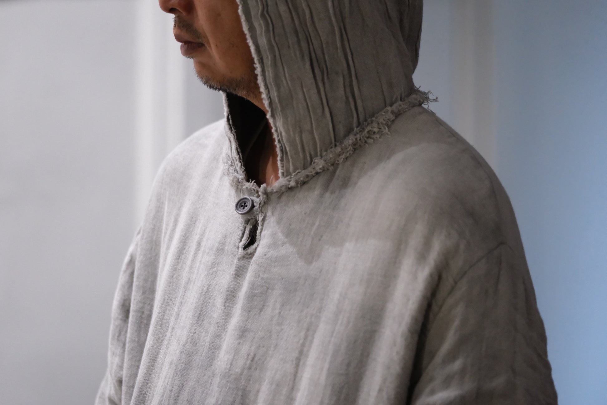 4重織のコットンガーゼ生地に、裏地にオーガニックコットンのダブルガーゼをライニングし、合計で6重織の厚みを作ったパーカー。スウェットの代わりになるような生地を表現したくトライしました。スウェットパーカーの替わり。独特の反発性が生地にあります。またムラ感が出るように製品で墨染を行っております。