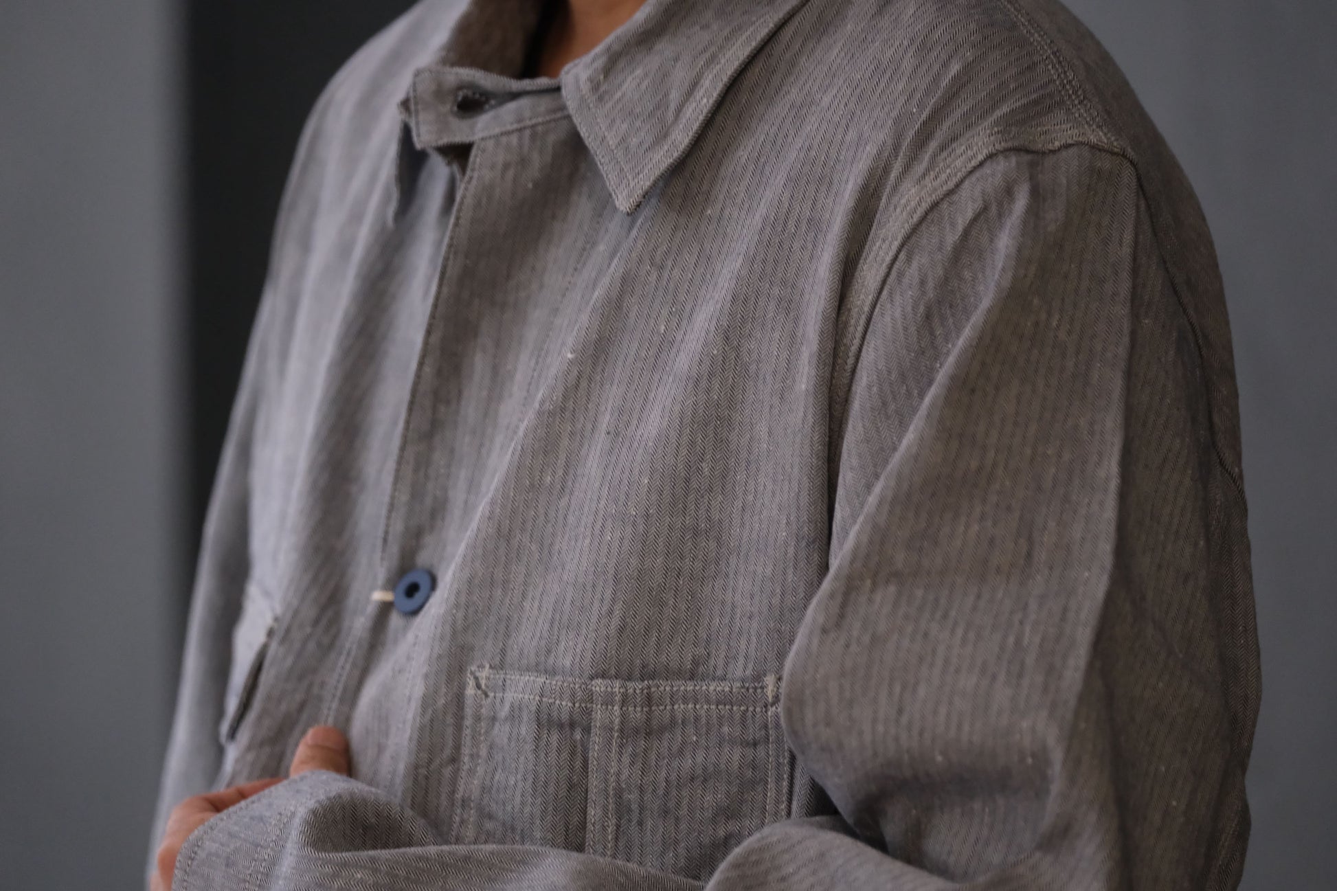 Li/Co Chevron経糸にリネン、緯糸にコットンの設計が、リネンのドライな風合いはそのままに、ヨコ方向のハリを抑えて、クリーンなシルエットをもたらしたシェブロンストライプ素材。
