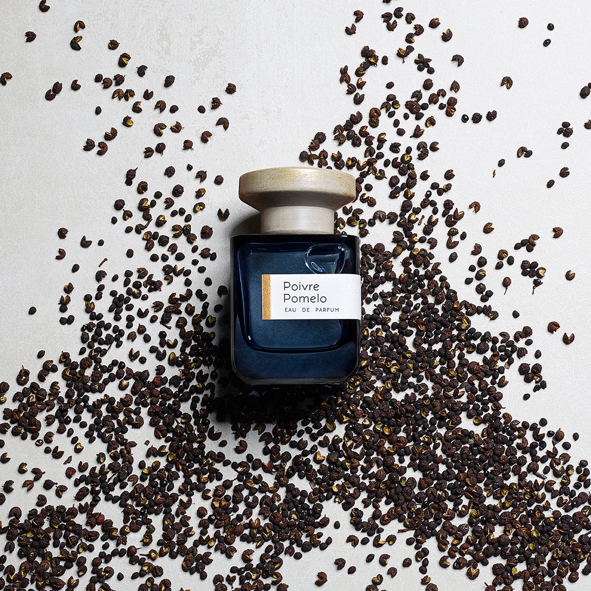 そこにグレープフルーツの ノートがアクセントとなり、ヴェチバーとマテがもたらすテクスチャーに 満ちたベースの上でフレッシュに輝きます。「ポワーヴル ポメロ」は色鮮 やかでシャープな、生き生きとした爽やかさをあたえてくれる香水です。