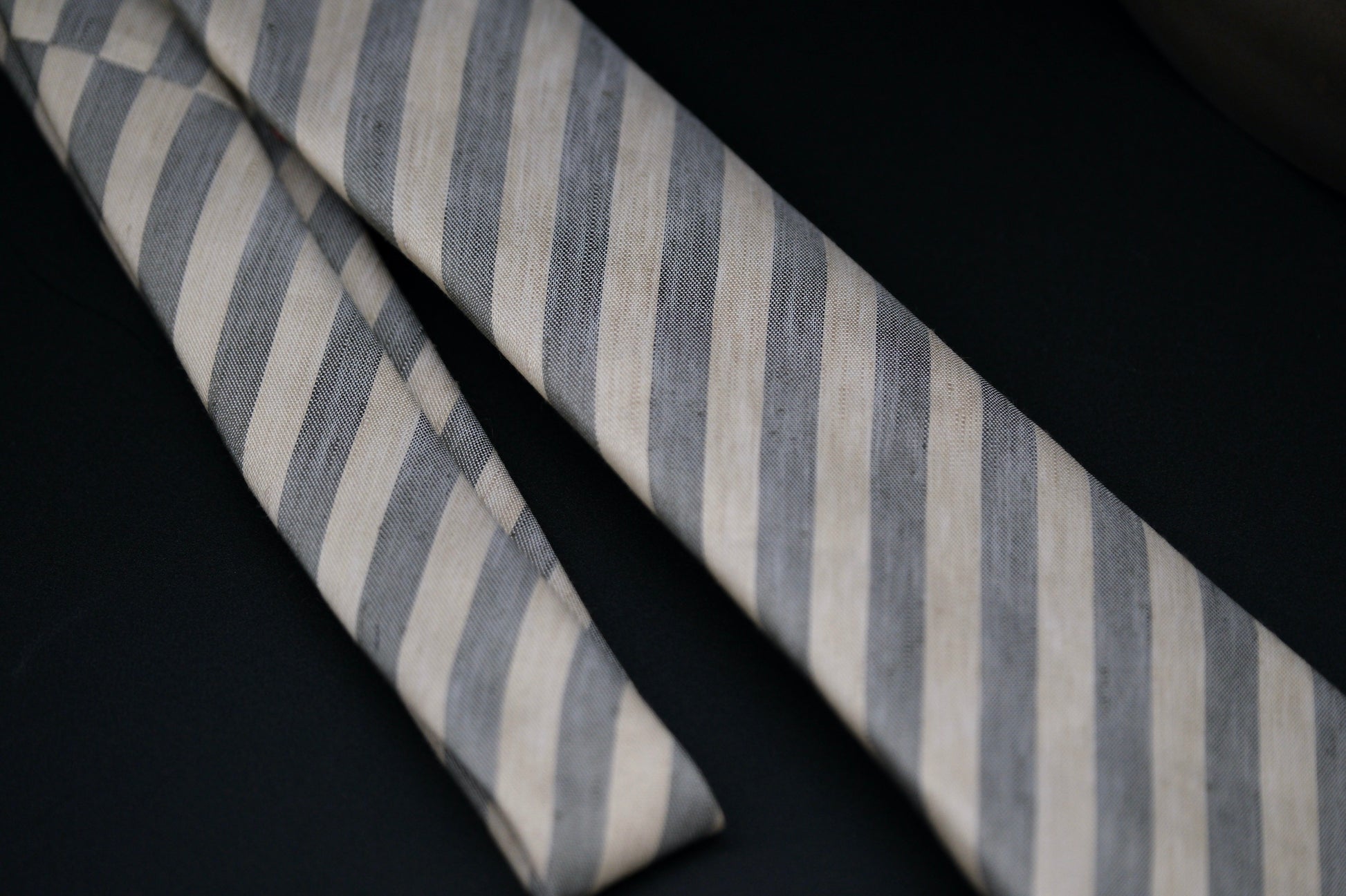 ガチガチにミシンで縫われ、アイロンで潰されたネクタイは捩れ、ハンドで柔らかく生地の伸縮を考えて丁寧に縫われたものはまっすぐ伸びる。