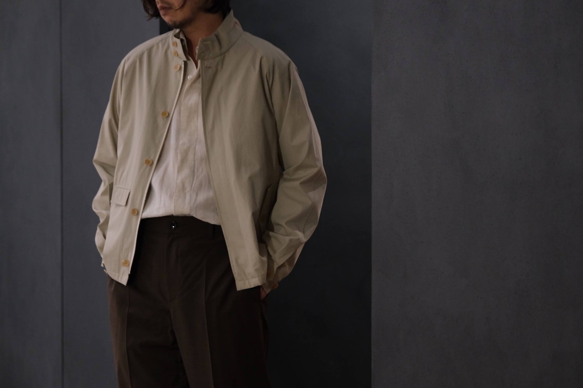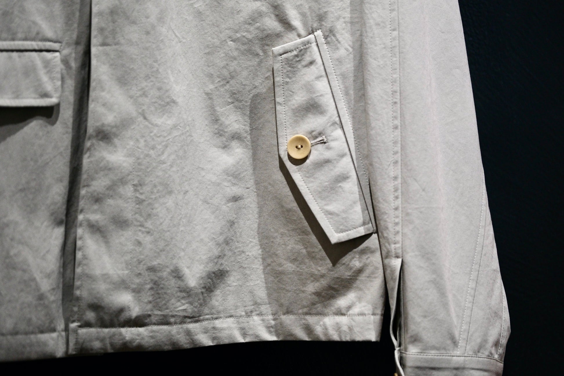 印象的なウォッチポケットや比翼前に加えて、ミリタリーコートに見られる、背のケープと袖が一体となった"ヨークスリーブ"を採用しています。モデルネーム"GIANNI"はそのスナップの際に撮影していた作品の主人公の役名から。