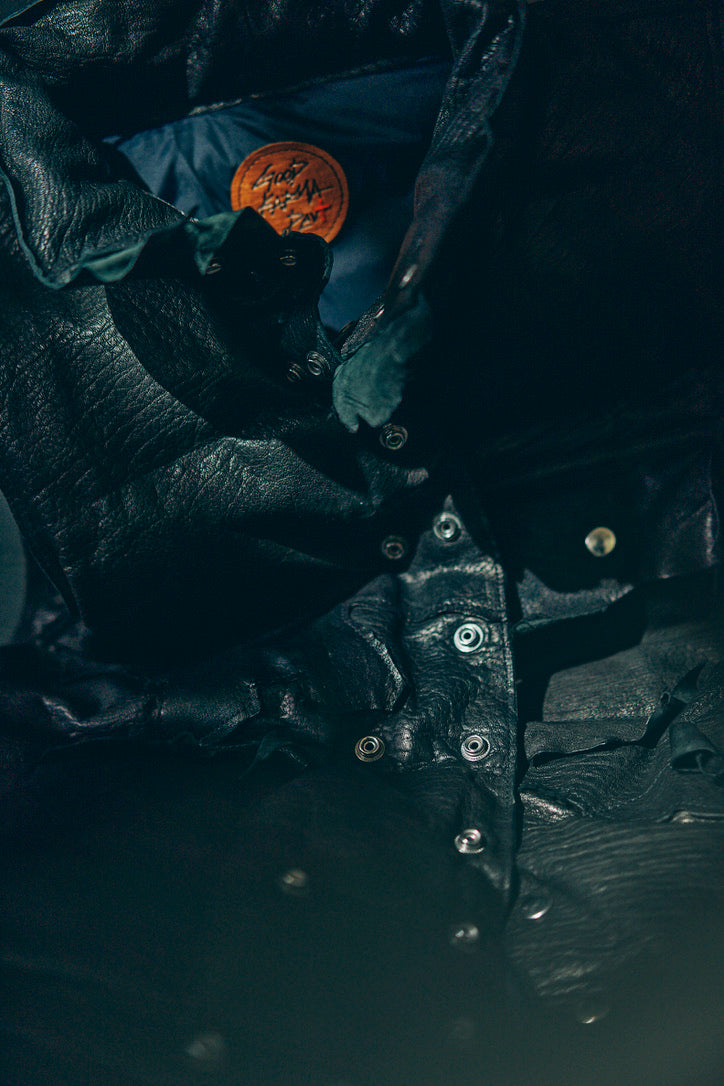 全て断ち切り(切りっぱなし)で処理し、エリ、ポケット、裾は元々のレザーが持つナチュラルエッジをデザインとして落とし込んでおりますので、どれも全く同じ物が存在しない完全なる一点物になります。