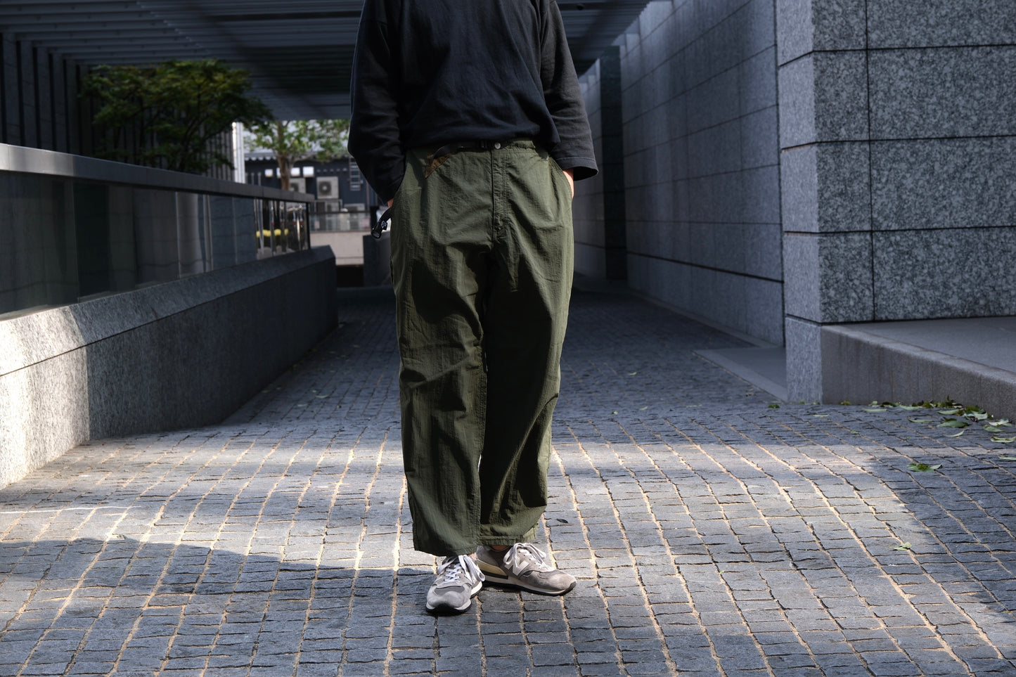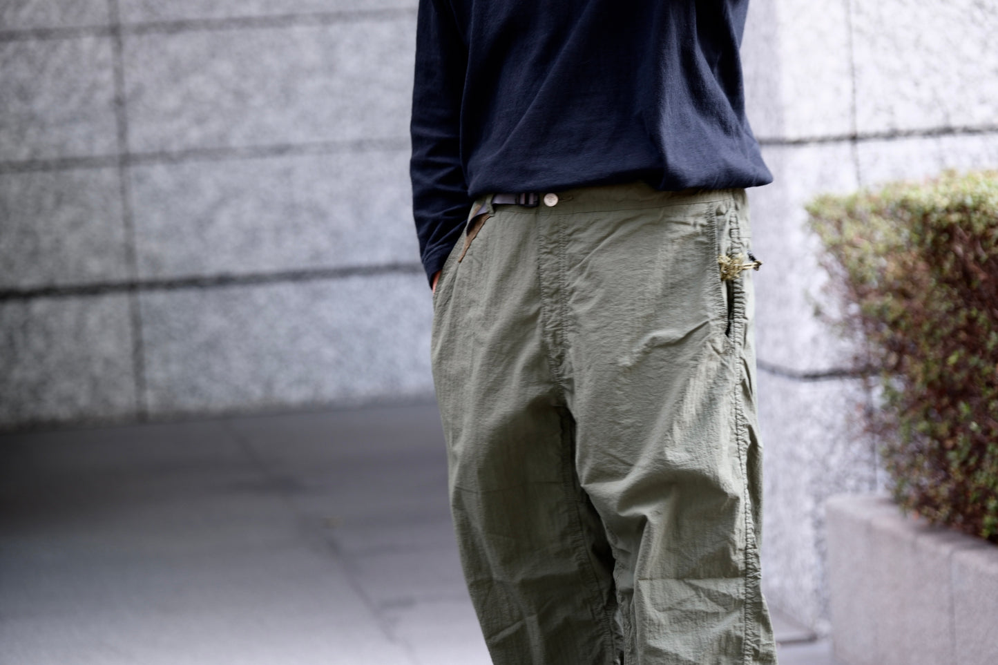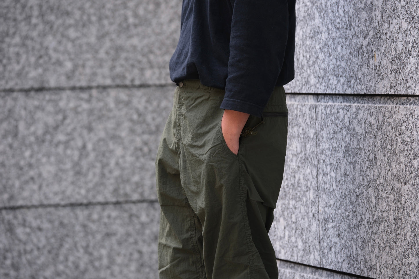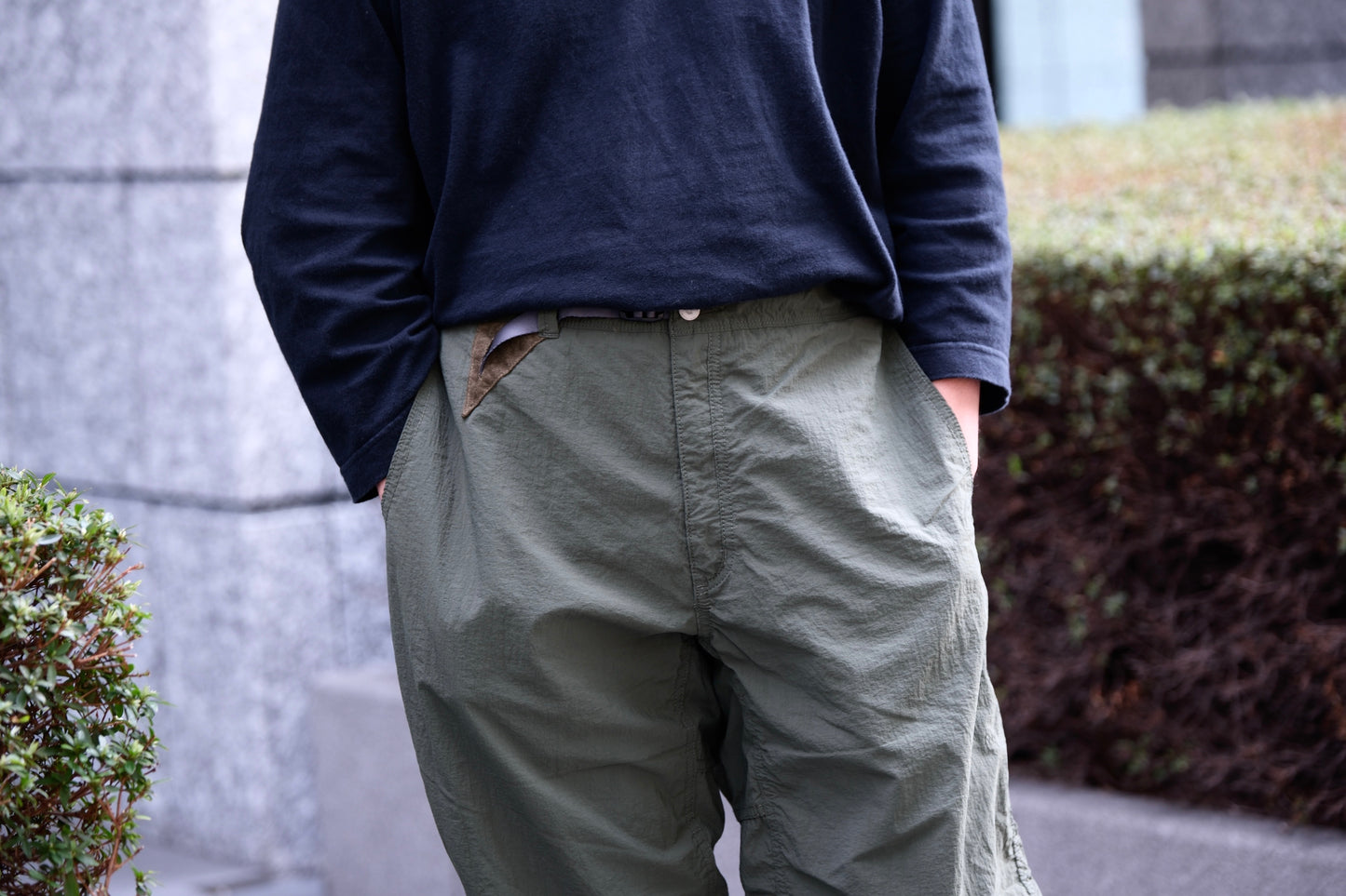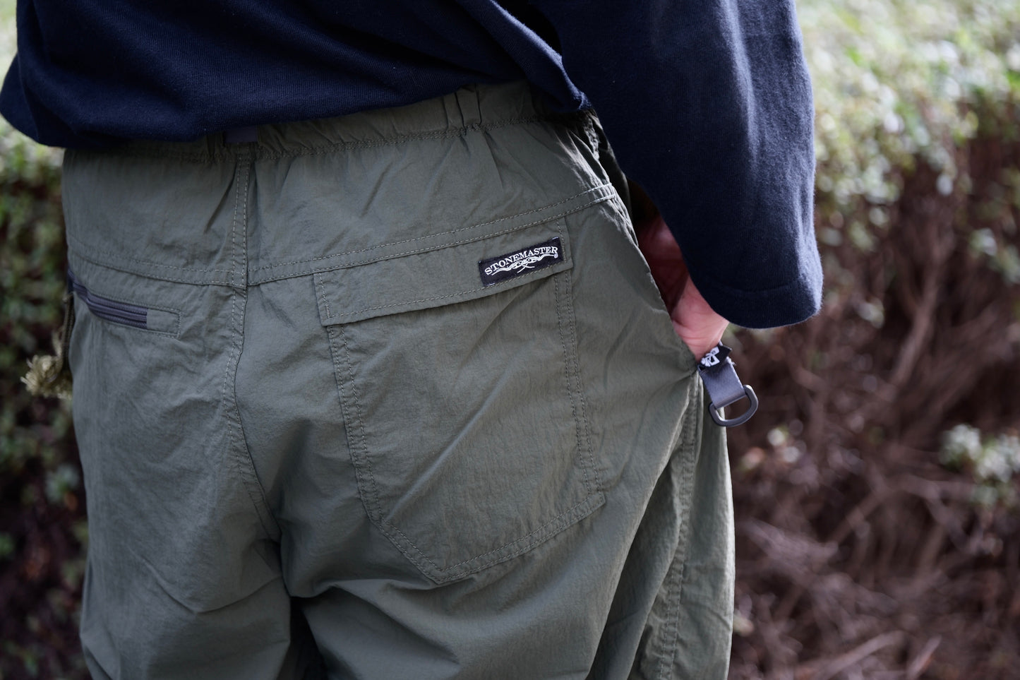 軽快感とシャリ感のある風合いを持つナイロン100%「フェザーナイロン」に載せ替えた定番パンツ ストーンマスターパンツ。気温・湿度が高い夏場の時期にはうってつけのドライ感のあるファブリックを提案。