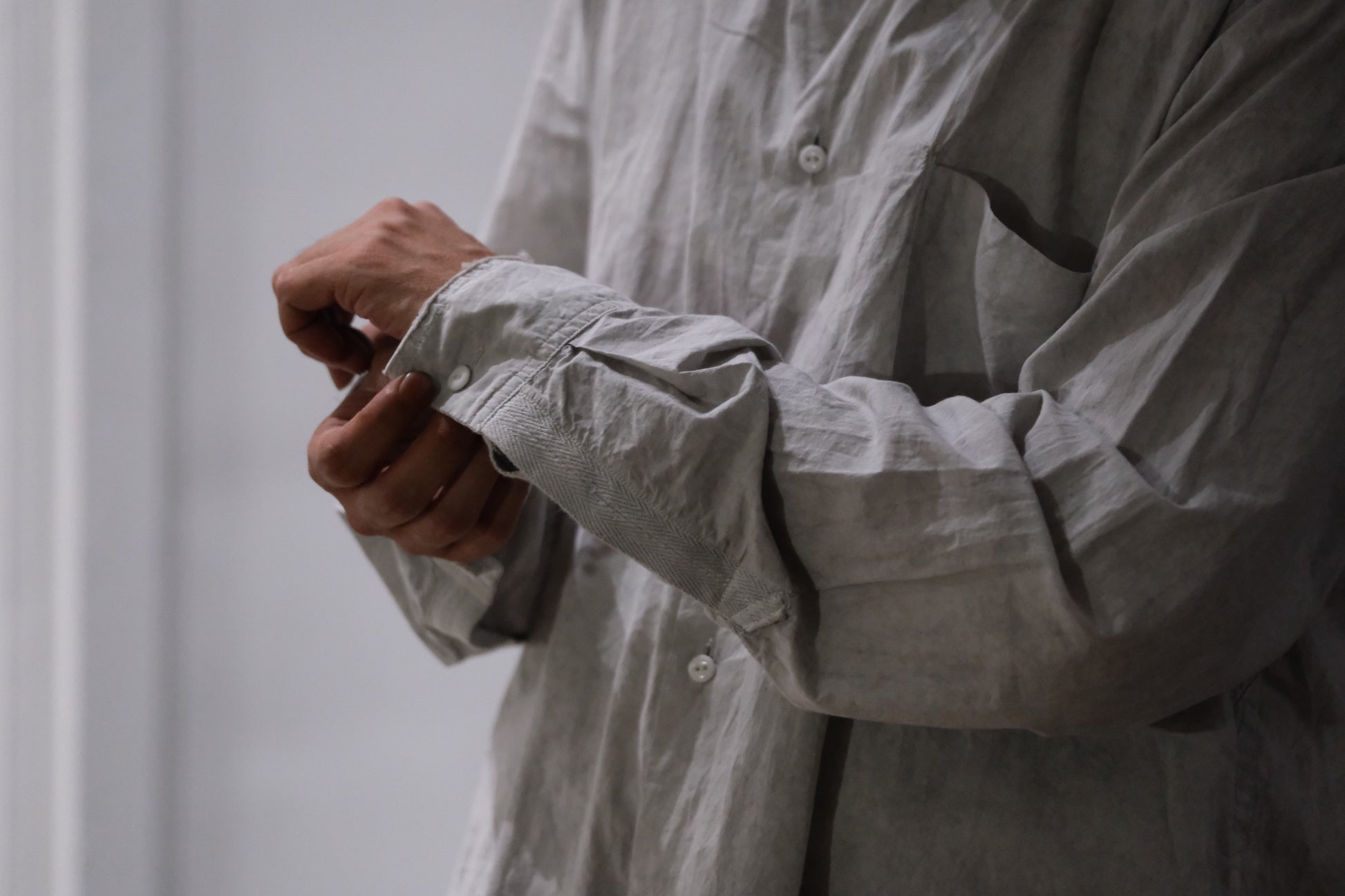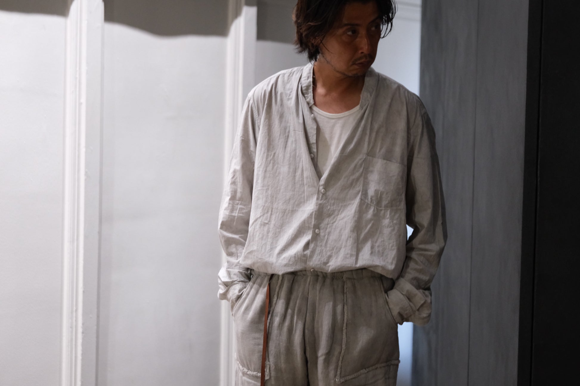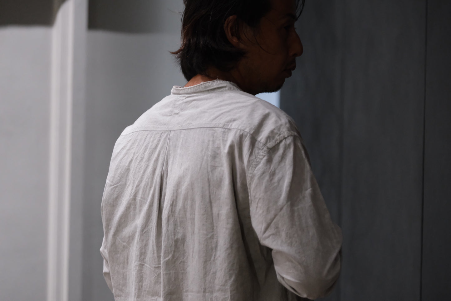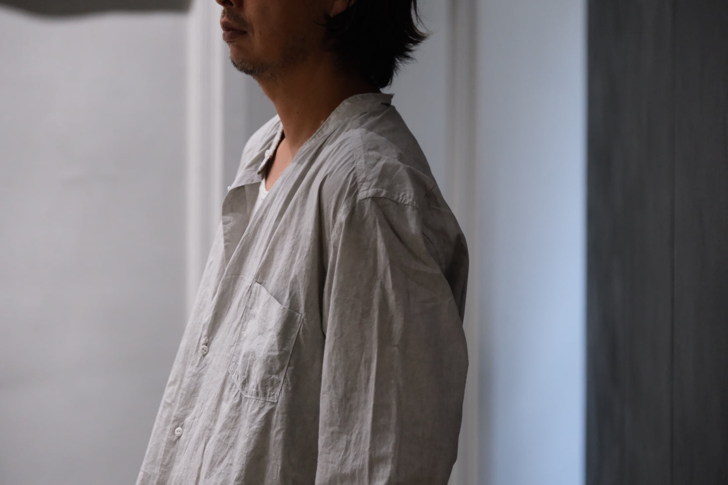 0.5〜1サイズほど、程よくオーバーサイズにしたスタンドカラーシャツ