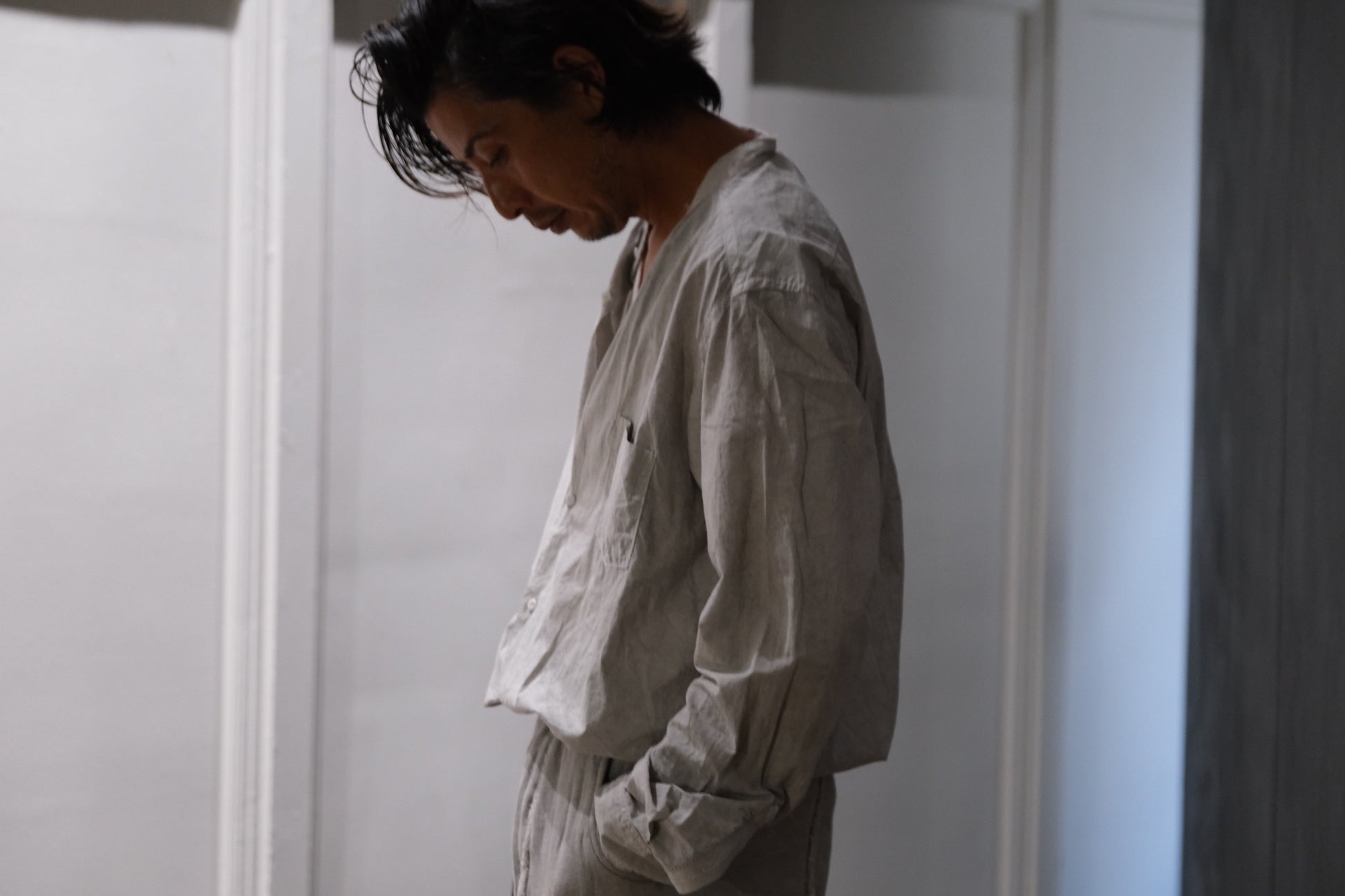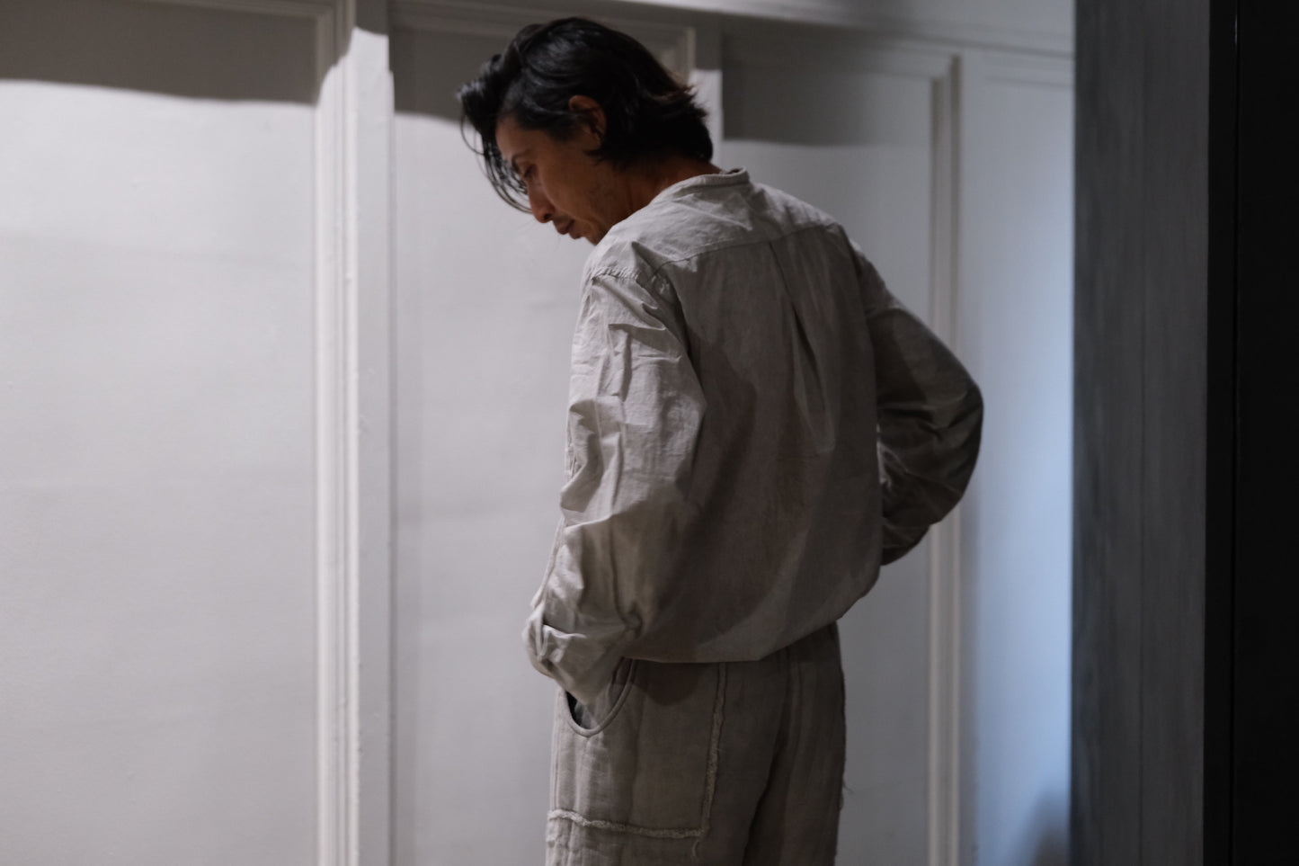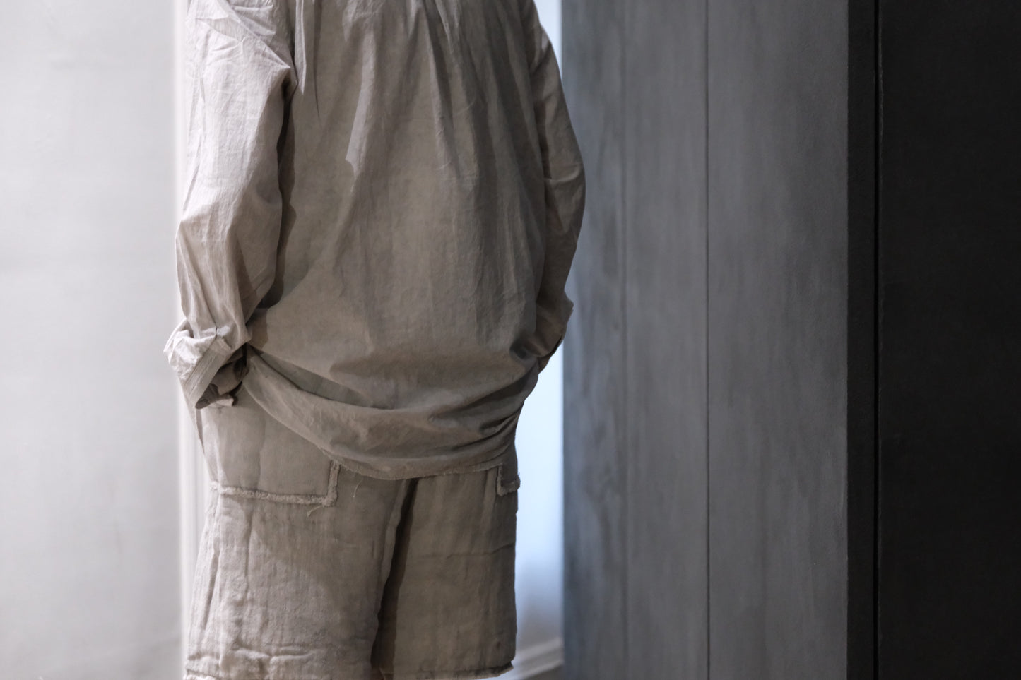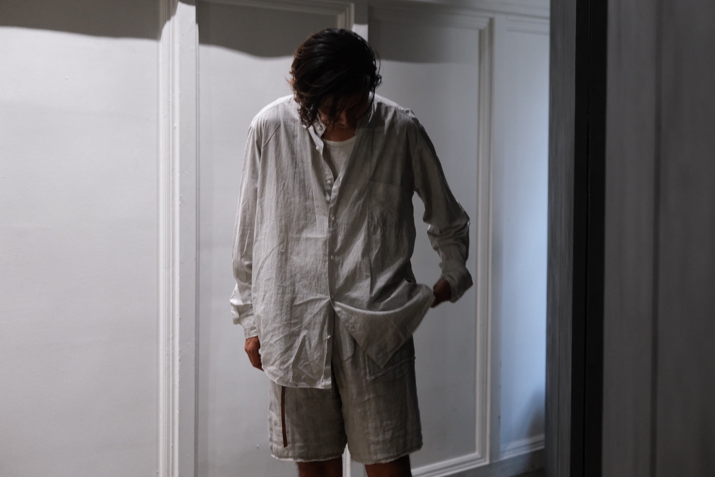 0.5〜1サイズほど、程よくオーバーサイズにしたスタンドカラーシャツ