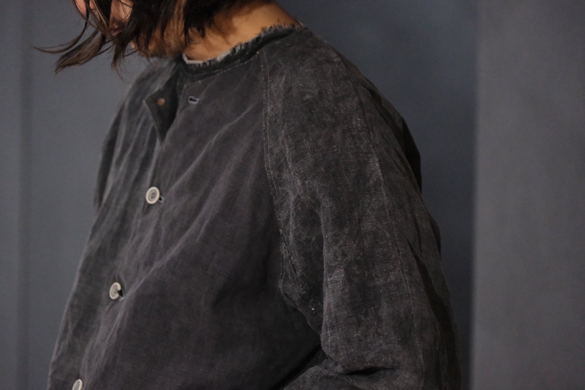 ヴィンテージのリネン、コットンリネンを生地の状態で2回墨染→縫製後製品で2回墨染しております。