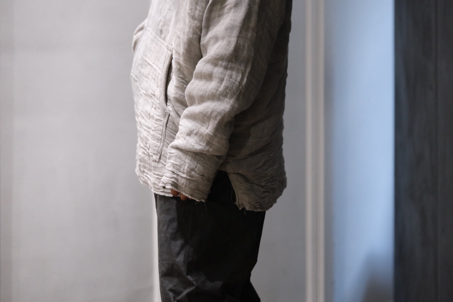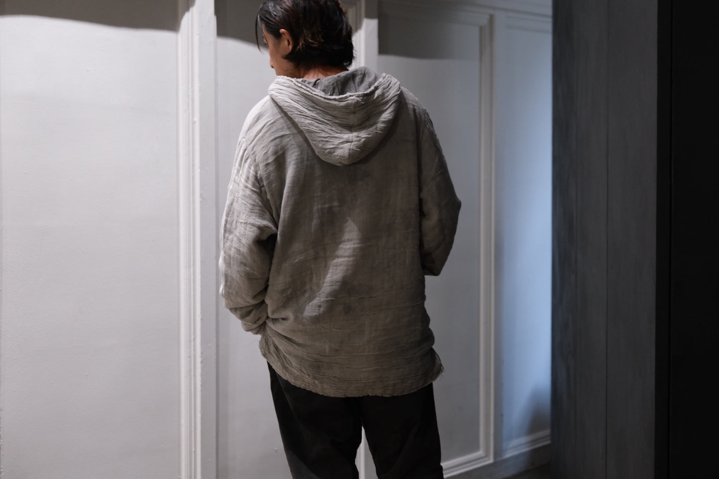4重織のコットンガーゼ生地に、裏地にオーガニックコットンのダブルガーゼをライニングし、合計で6重織の厚みを作ったパーカー。スウェットの代わりになるような生地を表現したくトライしました。スウェットパーカーの替わり。独特の反発性が生地にあります。またムラ感が出るように製品で墨染を行っております。
