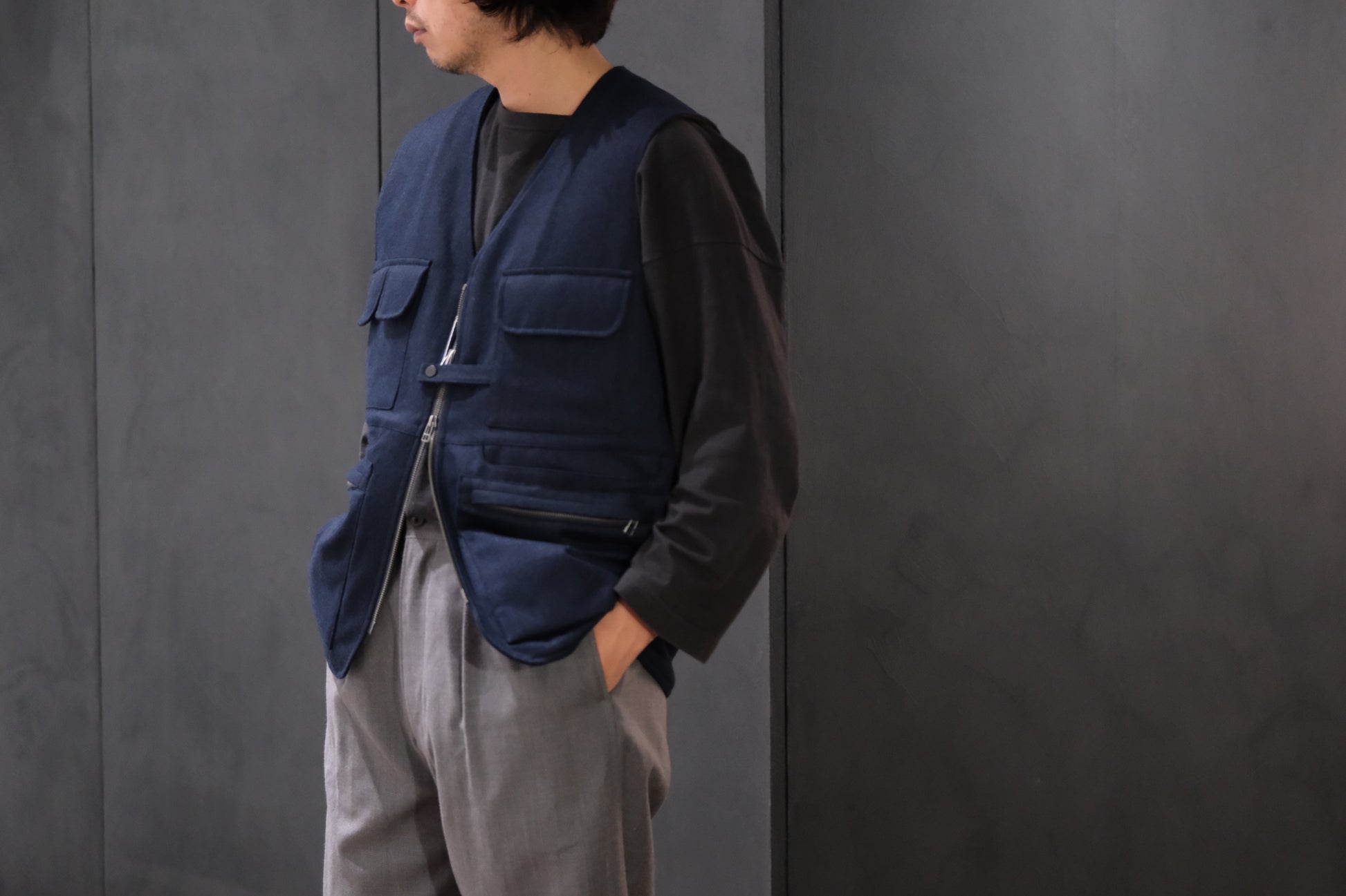 Mod.CICIは、とある建築家、工業デザイナーの1988年のスナップにインスピレーションに得て製作されました。そこで彼が着用しているマルチポケットのフォトグラファーベストは、機能的でユニークでもある彼自身のデザインと共鳴してるかのように見えます。
