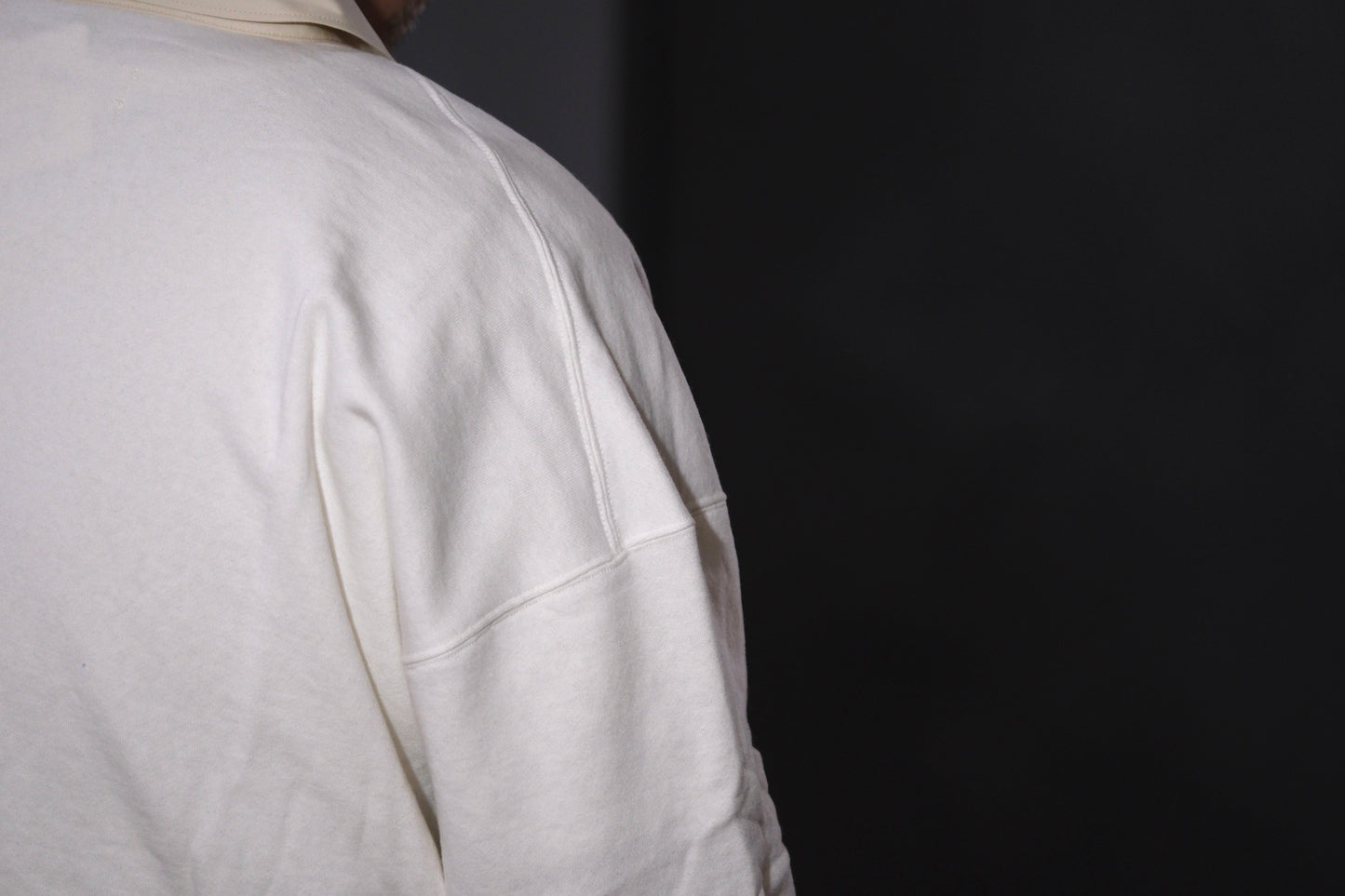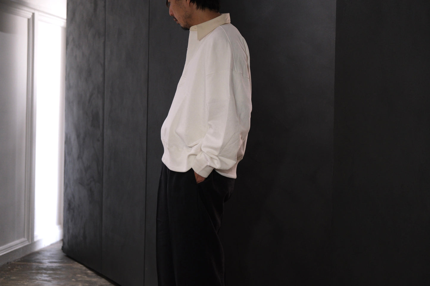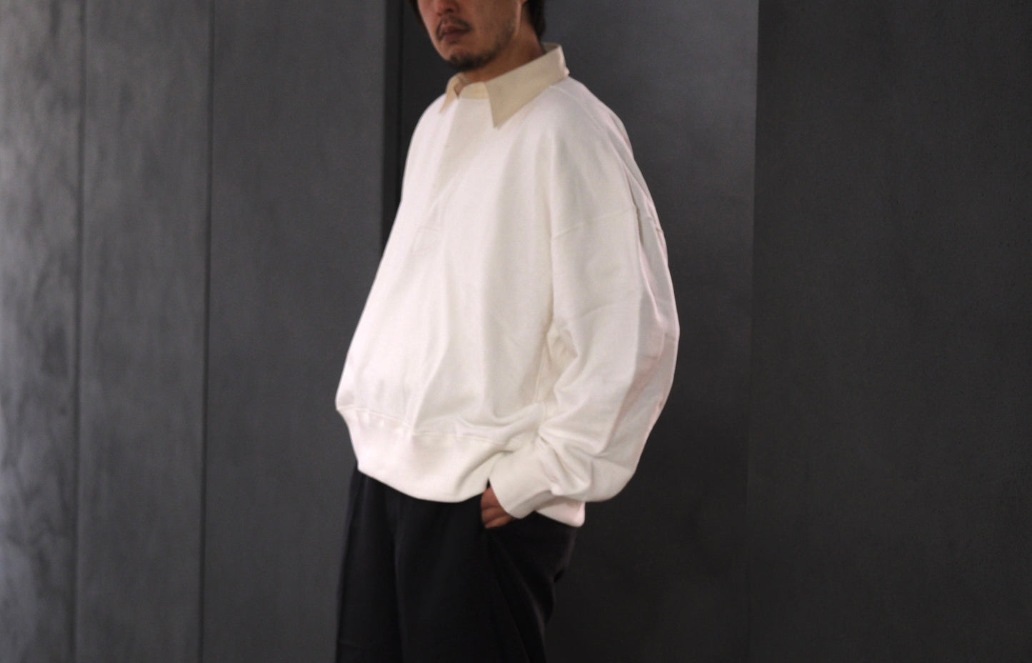 襟のデザインだけ布帛の切り替えにし、全てを裏毛にせず首周りだけしっかりと締めるメリハリの効いたデザイン。