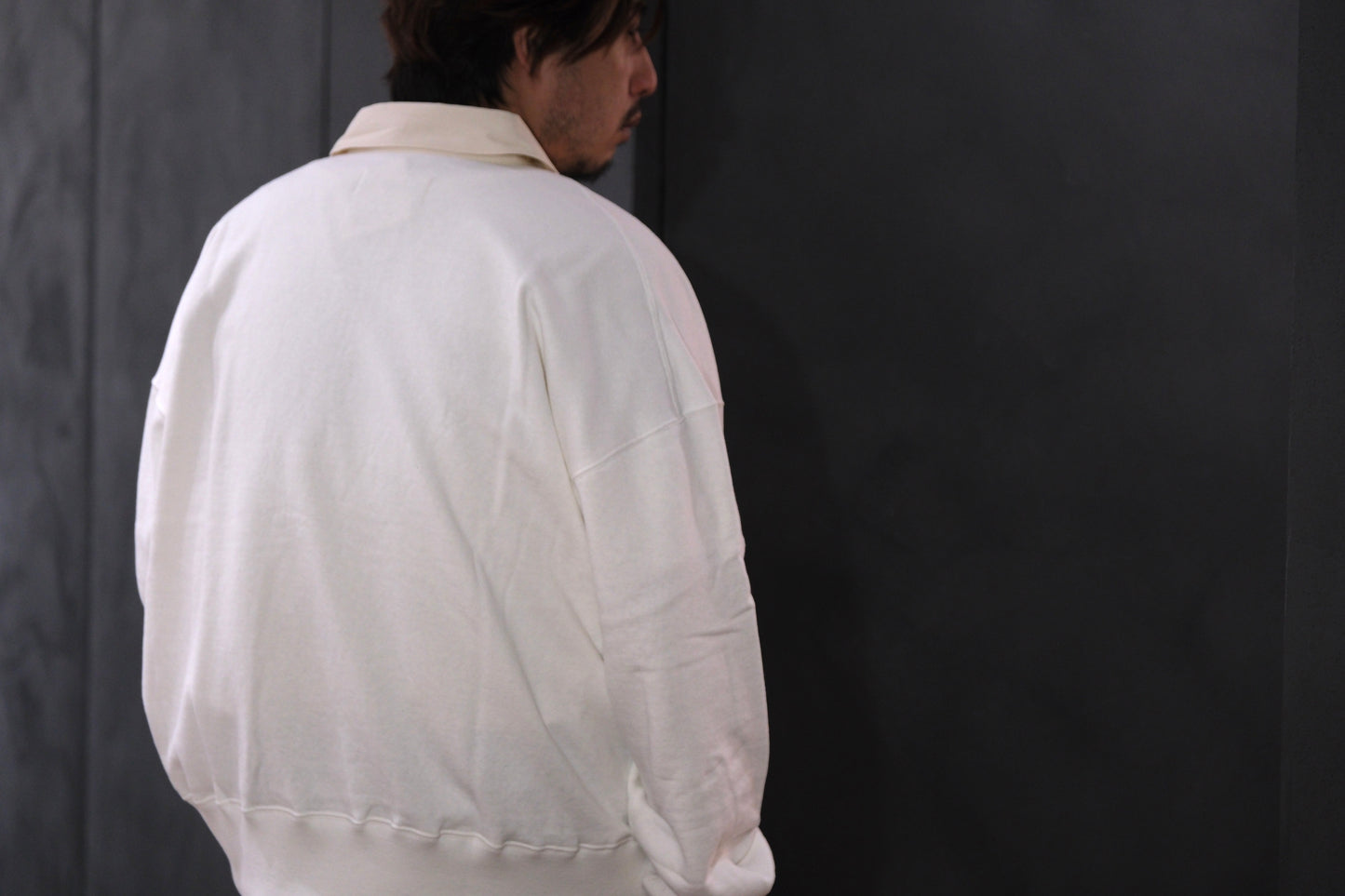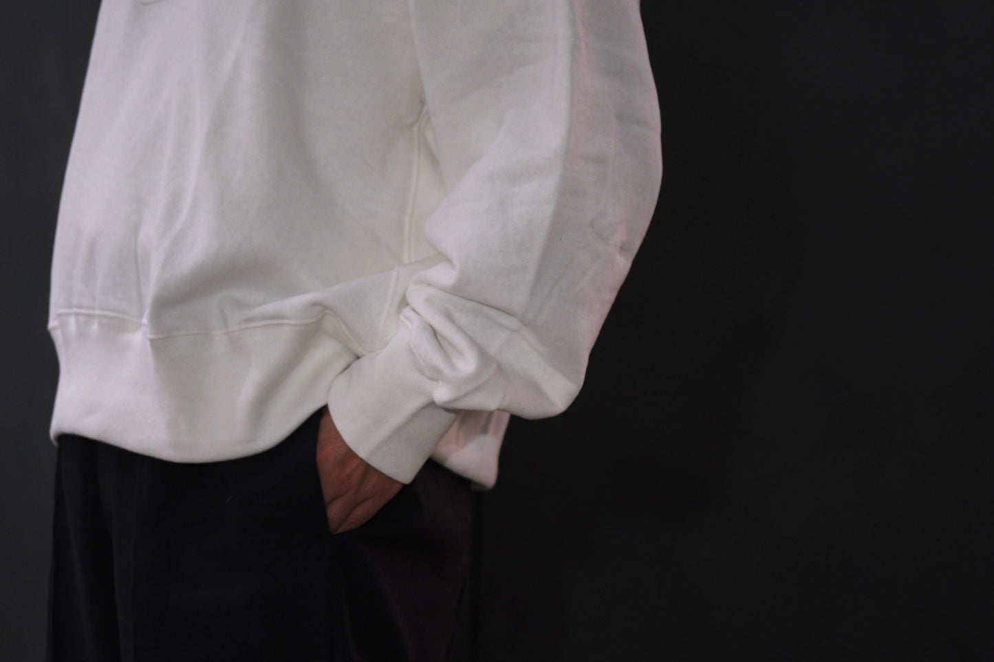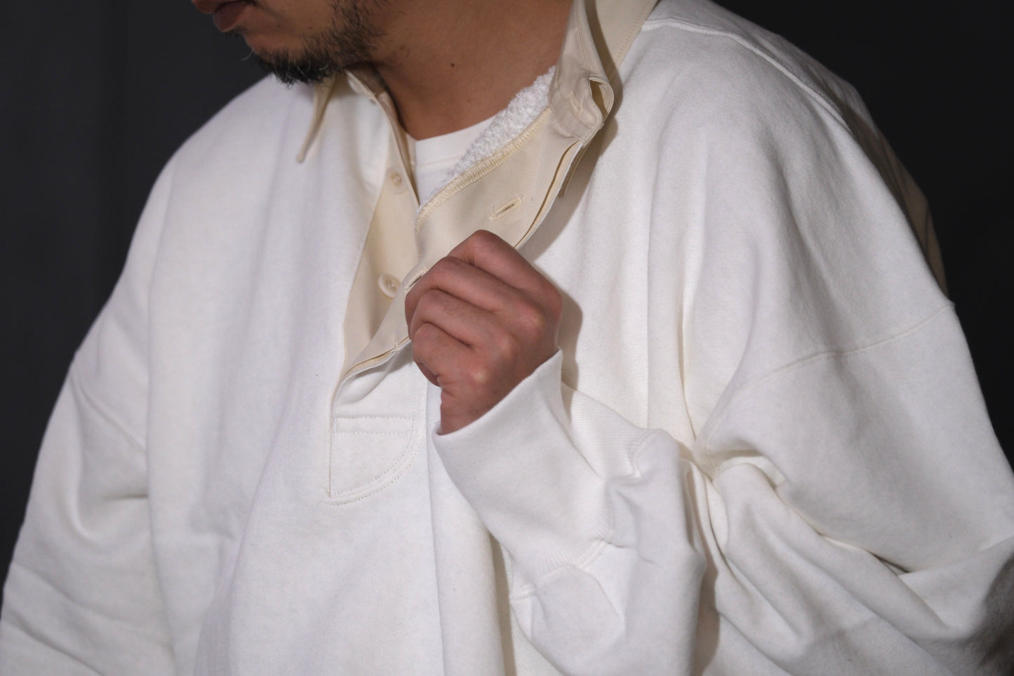 襟のデザインだけ布帛の切り替えにし、全てを裏毛にせず首周りだけしっかりと締めるメリハリの効いたデザイン。