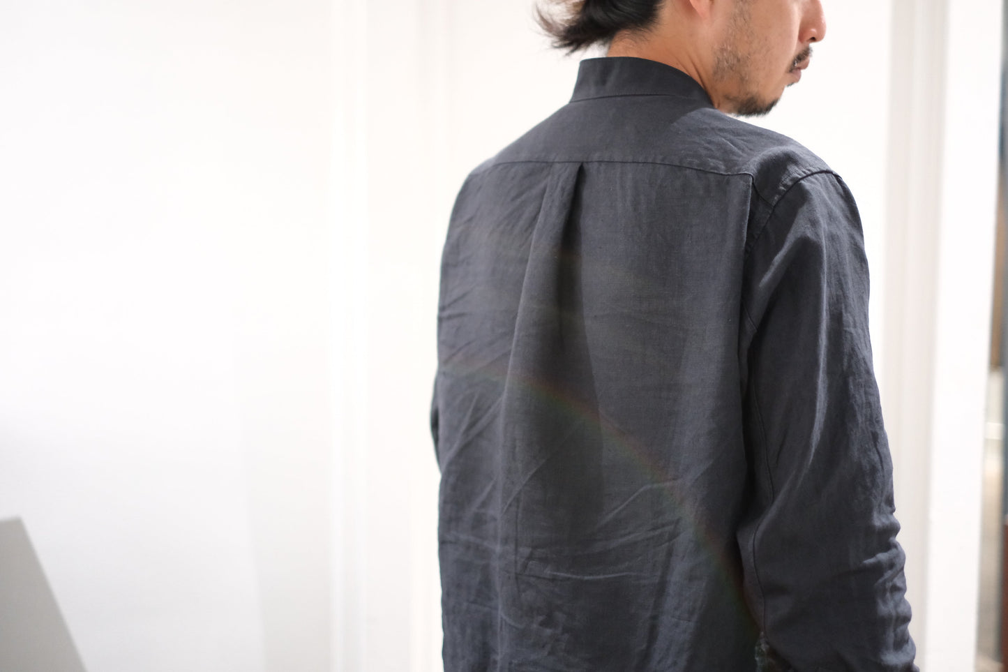 ドレスシャツの見た目に少し太めのシルク糸がアクセントになり、ステッチはキツめに縫い込んでおり一度洗濯をすると綺麗にパッカリングが入りガラッと表情が変わります。
