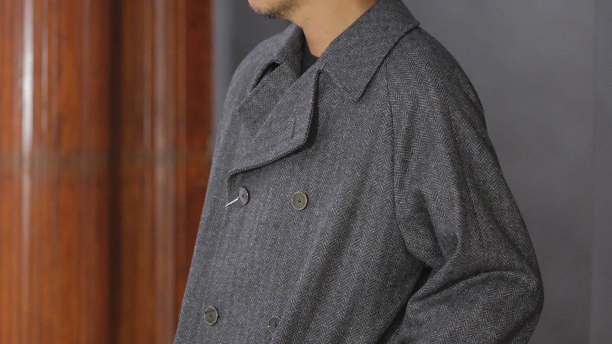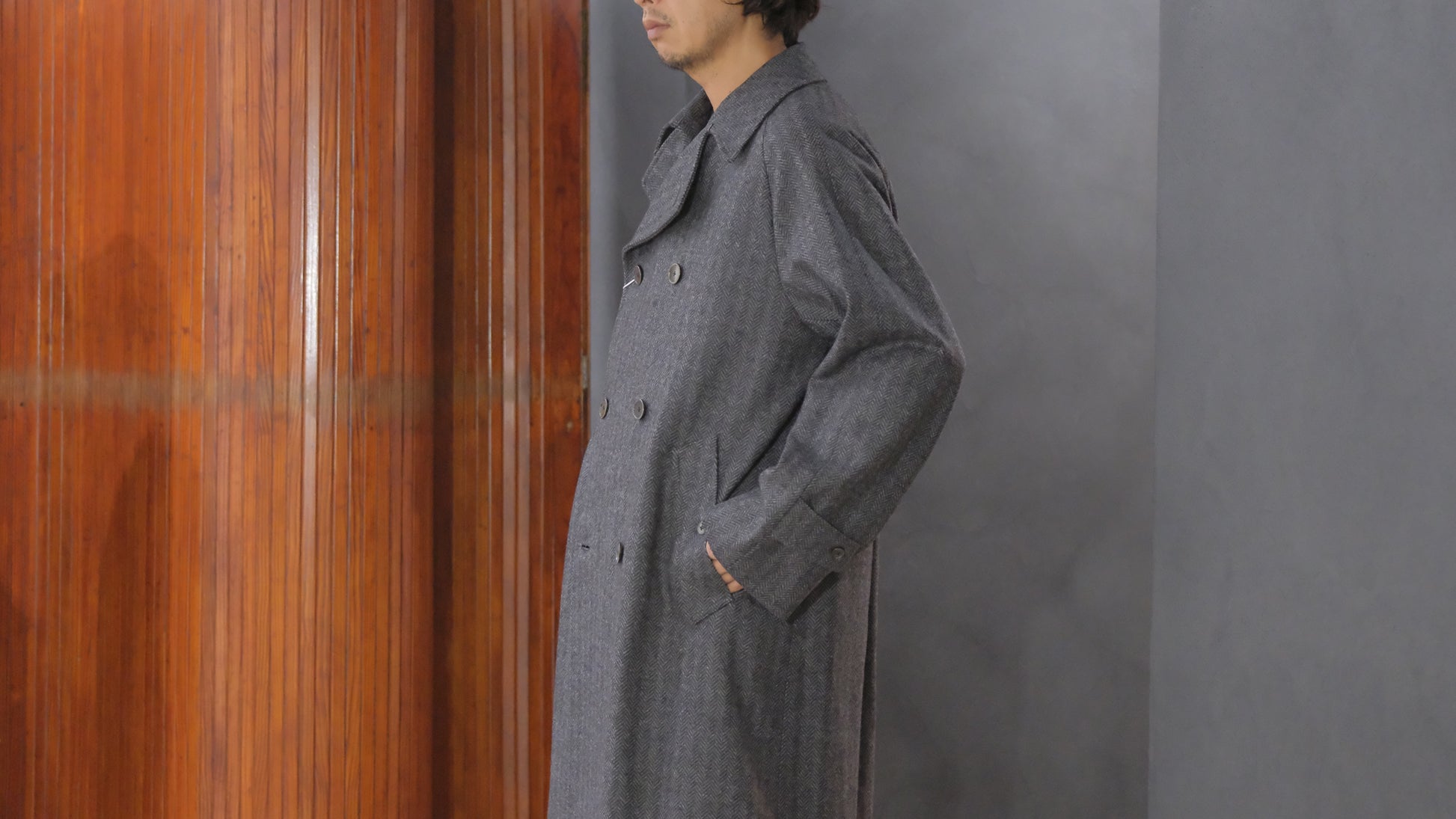 1928年にドーヴィル海岸を訪れた際のスナップ写真をベースに、ベルト無し、ダブルブレスト、という共通のディテールをもつ当時の”Motoring Coat”(カーコート)をもう一つのインスピレーションとしました。