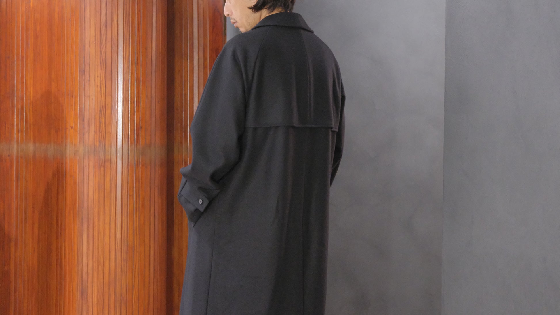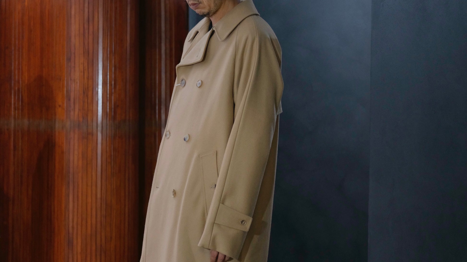 1928年にドーヴィル海岸を訪れた際のスナップ写真をベースに、ベルト無し、ダブルブレスト、という共通のディテールをもつ当時の”Motoring Coat”(カーコート)をもう一つのインスピレーションとしました。