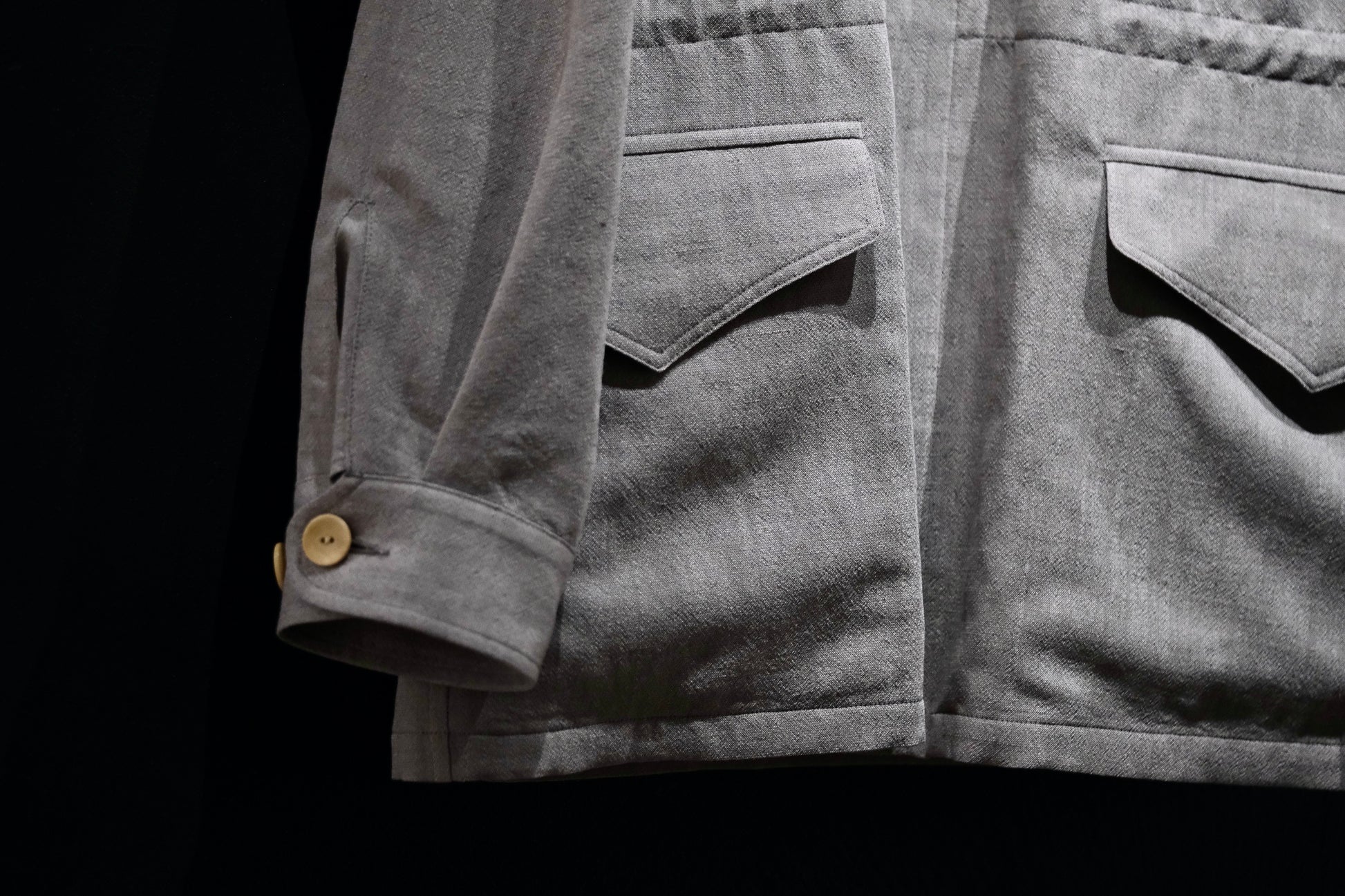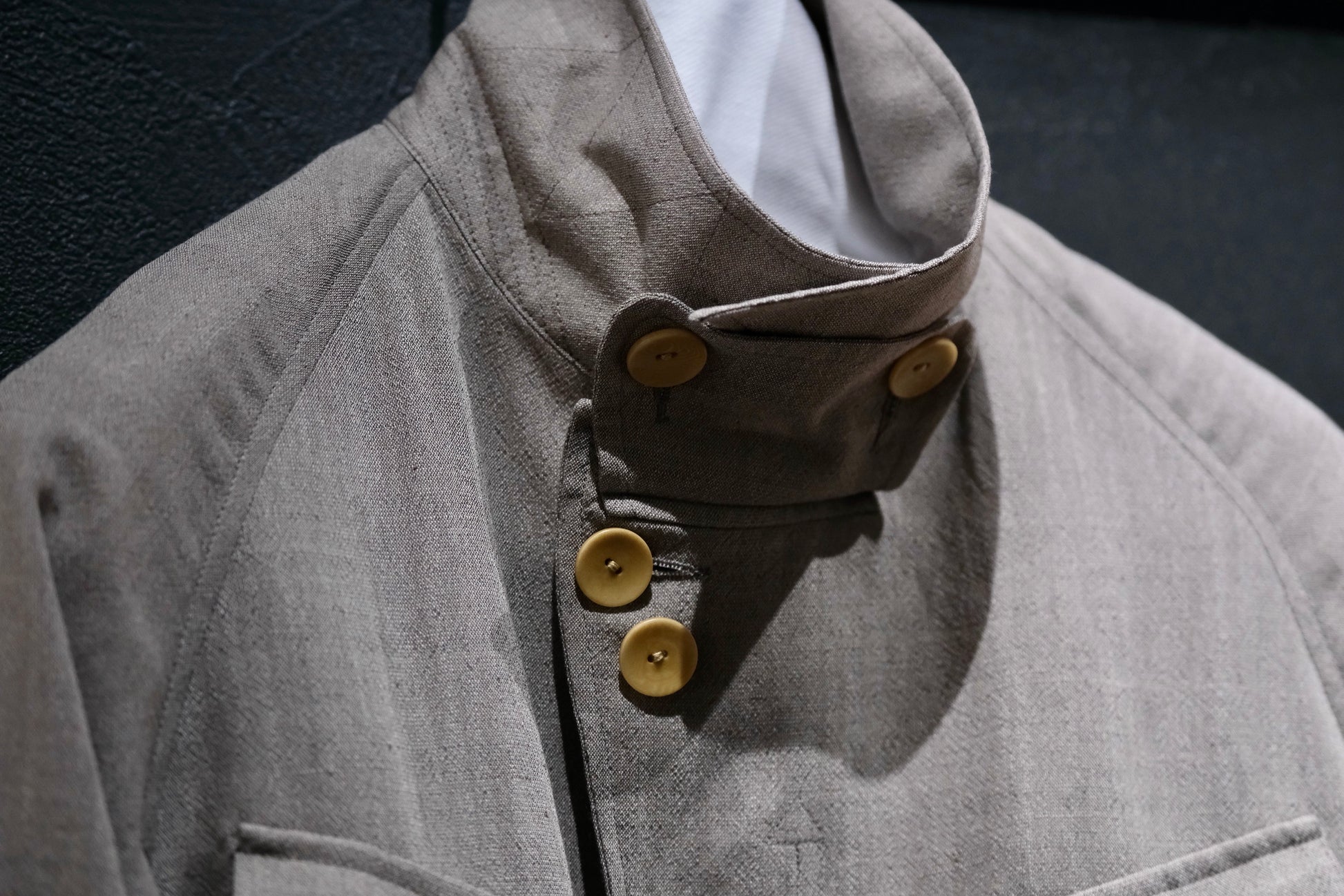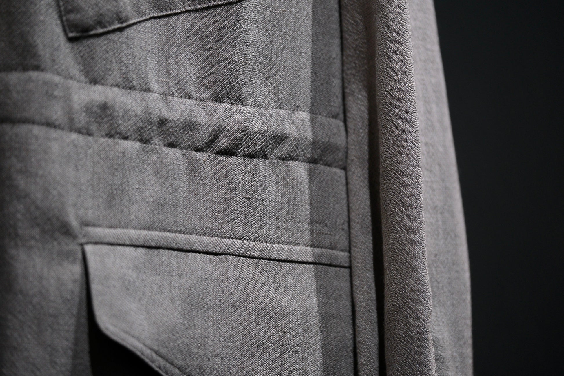 ウール・モヘア・リネン・ポリエステルという珍しい生地の配合の四者混の生地は、リネン特有のスラブ生地の表情が豊で清涼感のある涼しげで軽やかな印象のある生地です。