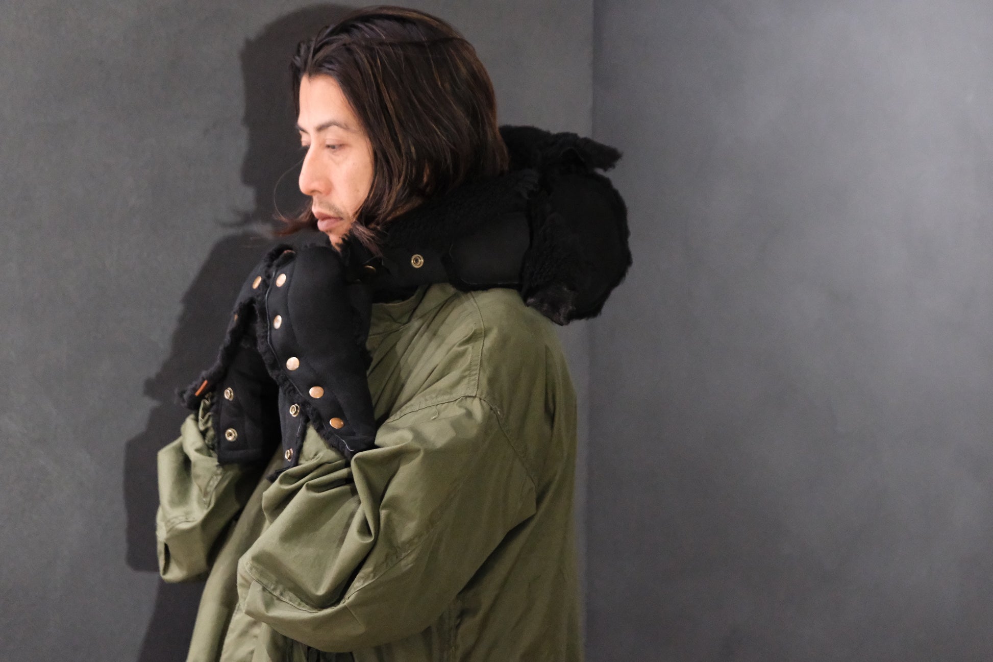 リバーシブルムートントラッカージャケット"LUKE"の前立てから着想を得て、バイヤー時代にカリフォルニアはヘイワードのウィップルロードにて入手したムートングローブをモチーフに製作致しました。