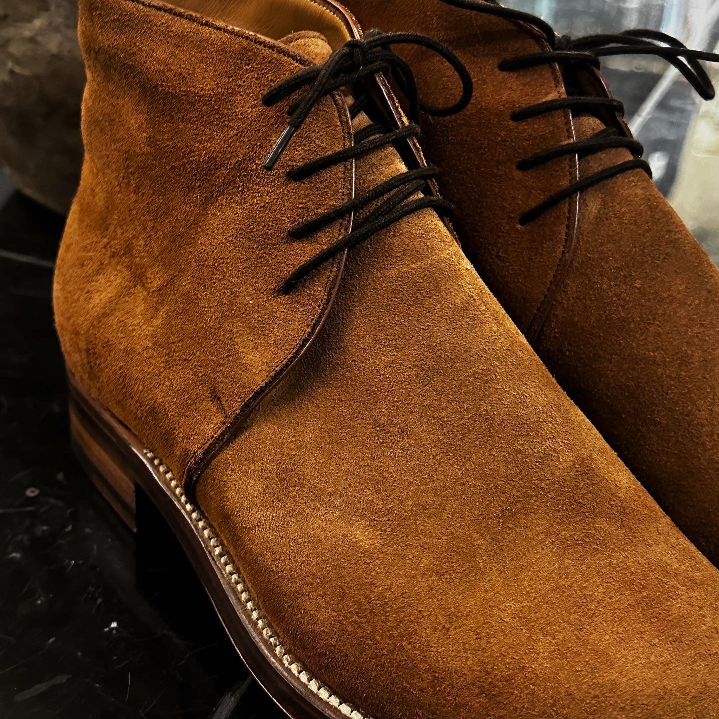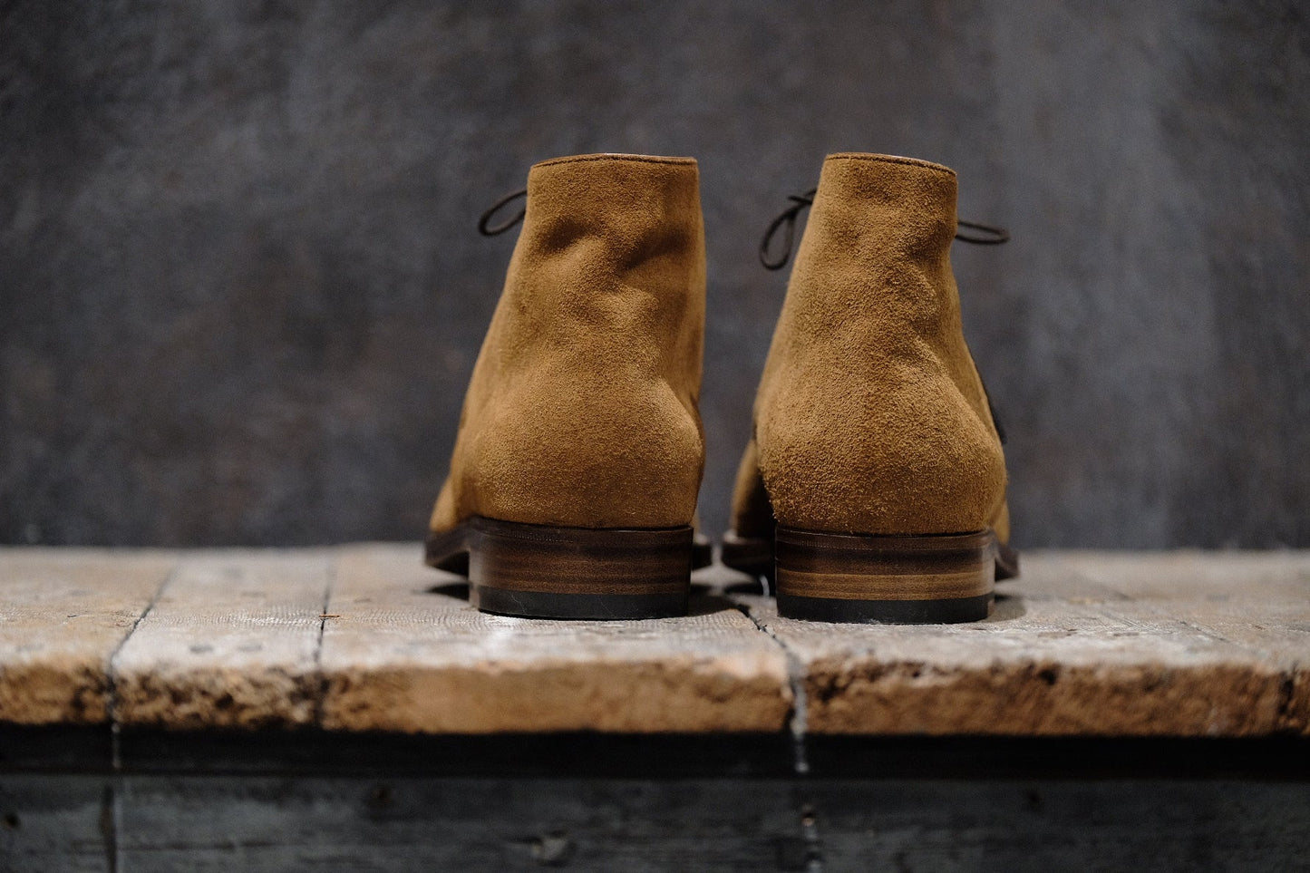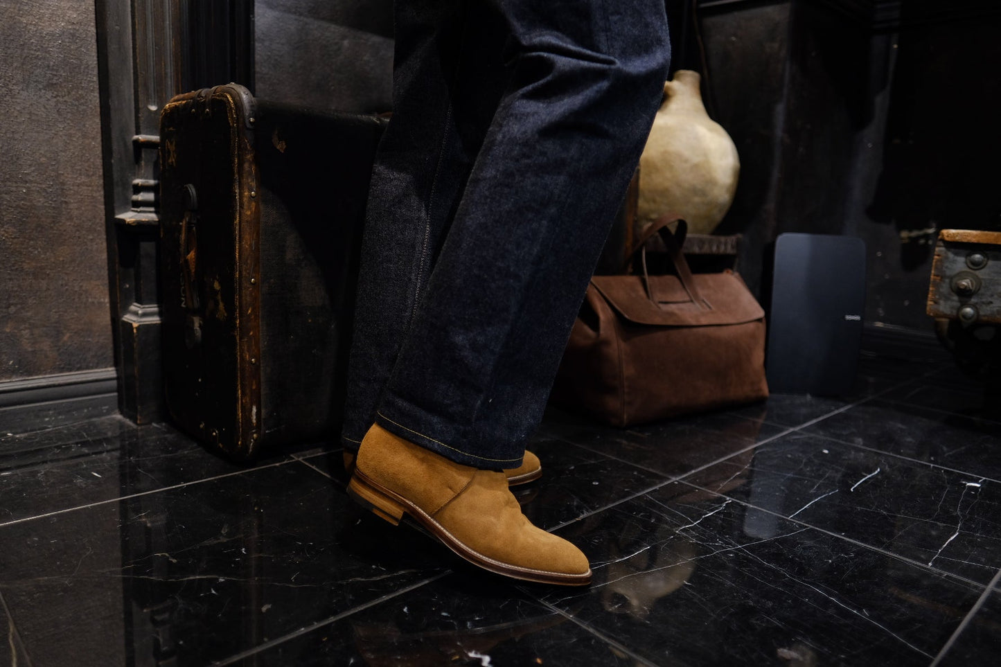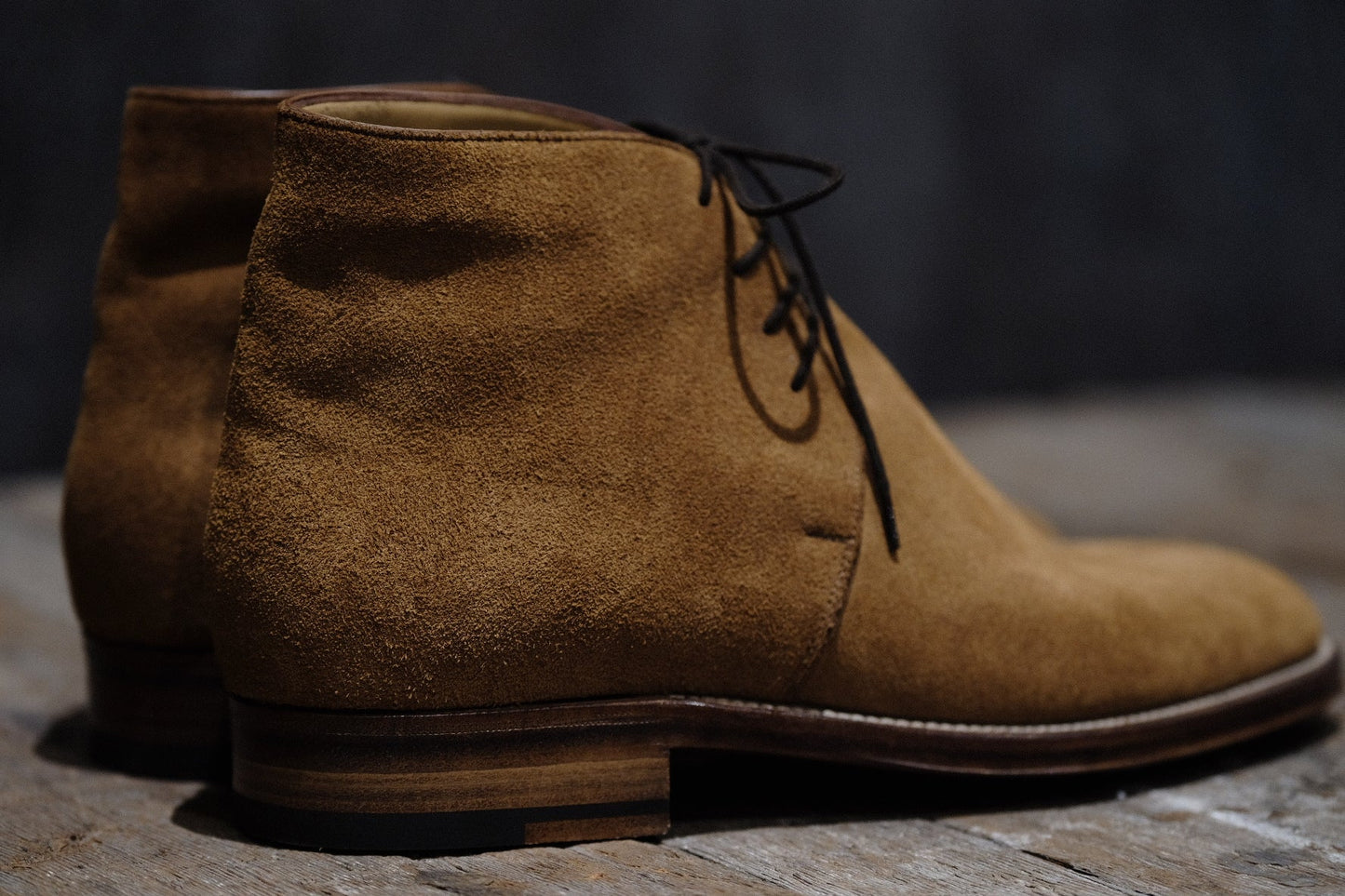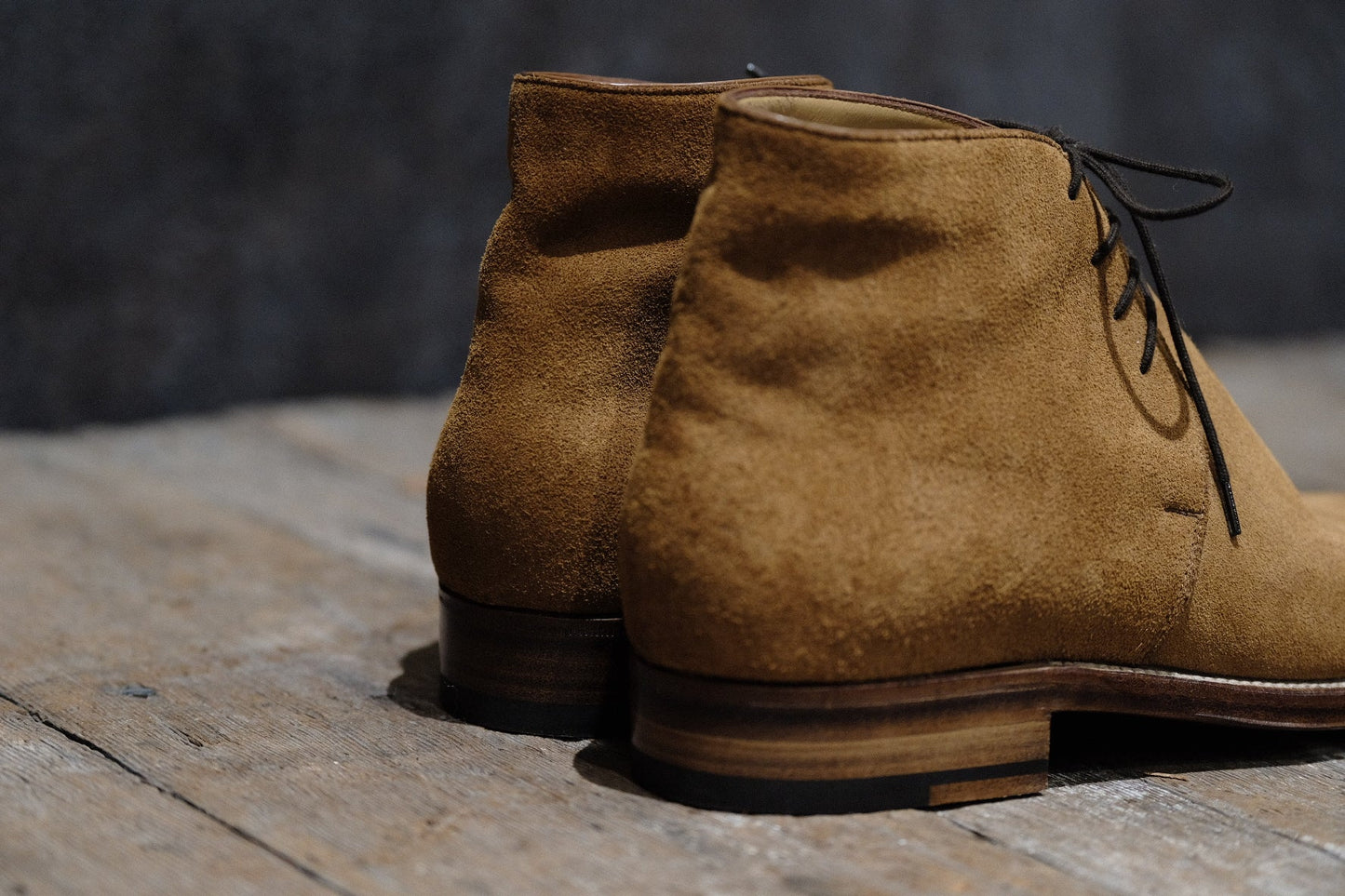 柔らかいスウェードは、踵にシームのない作りで、甲にシワを出しながら履く作り。