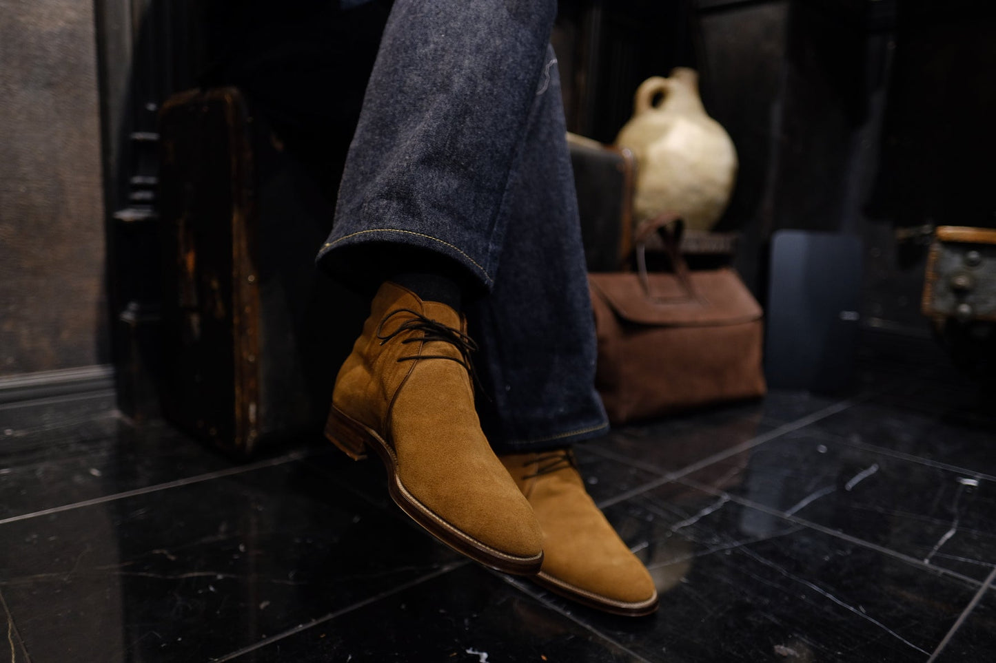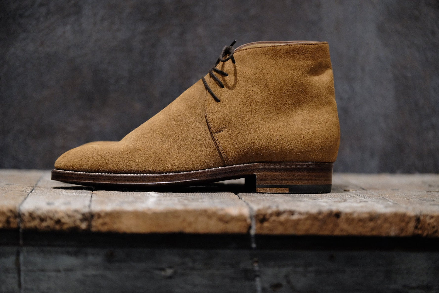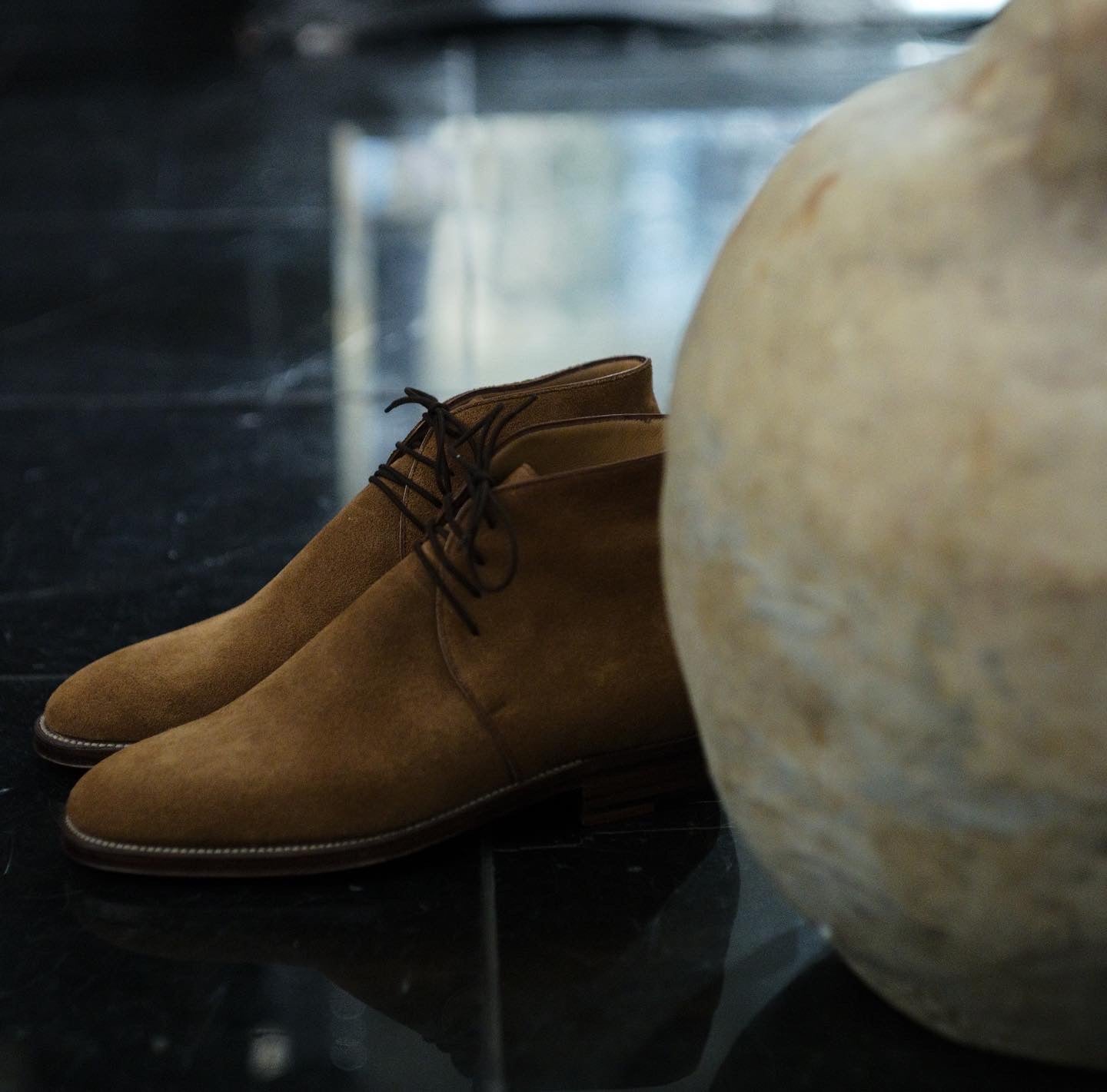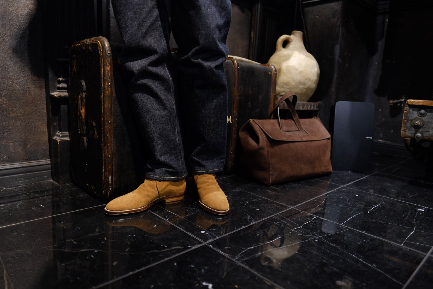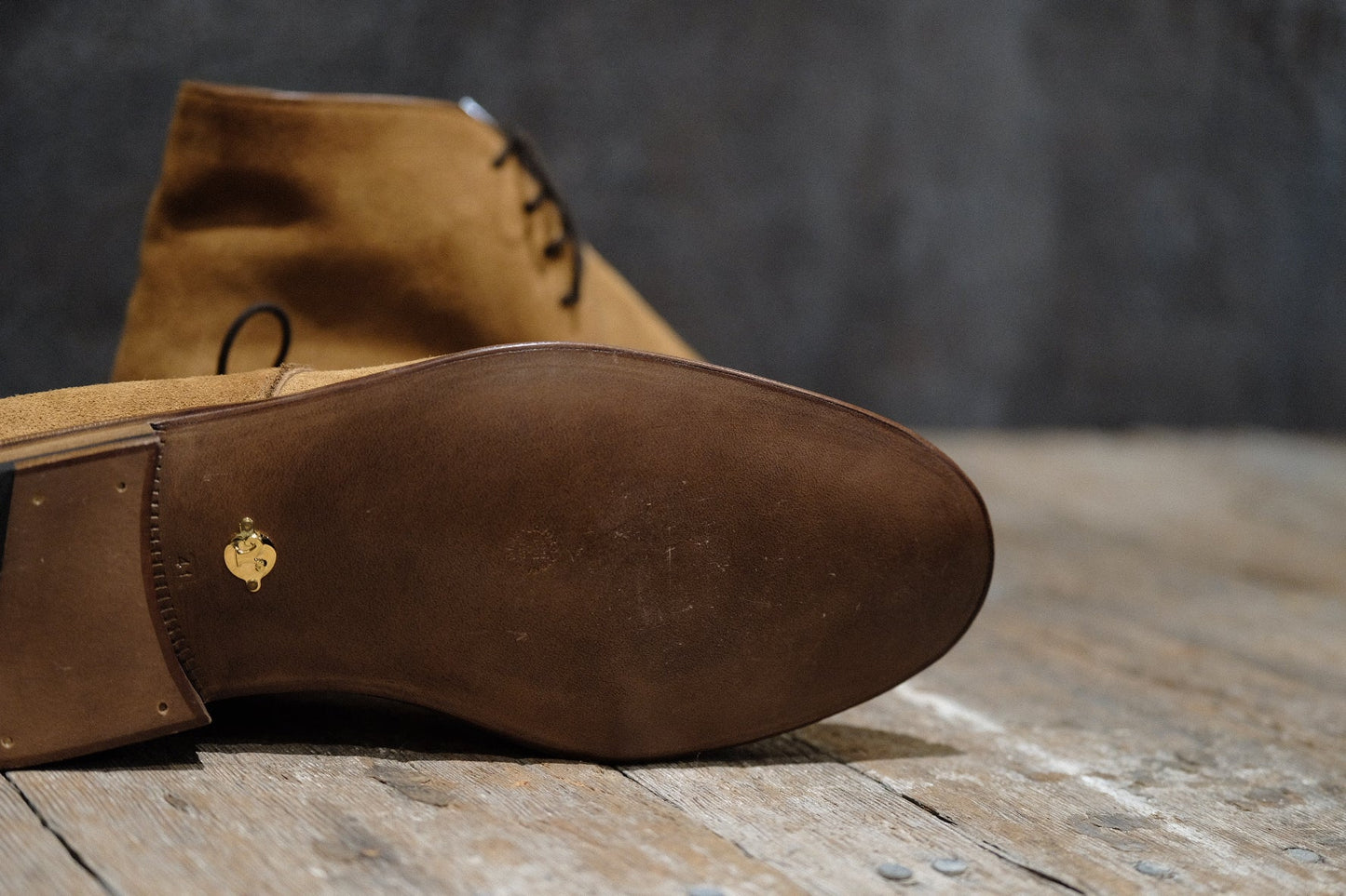 柔らかいスウェードは、踵にシームのない作りで、甲にシワを出しながら履く作り。