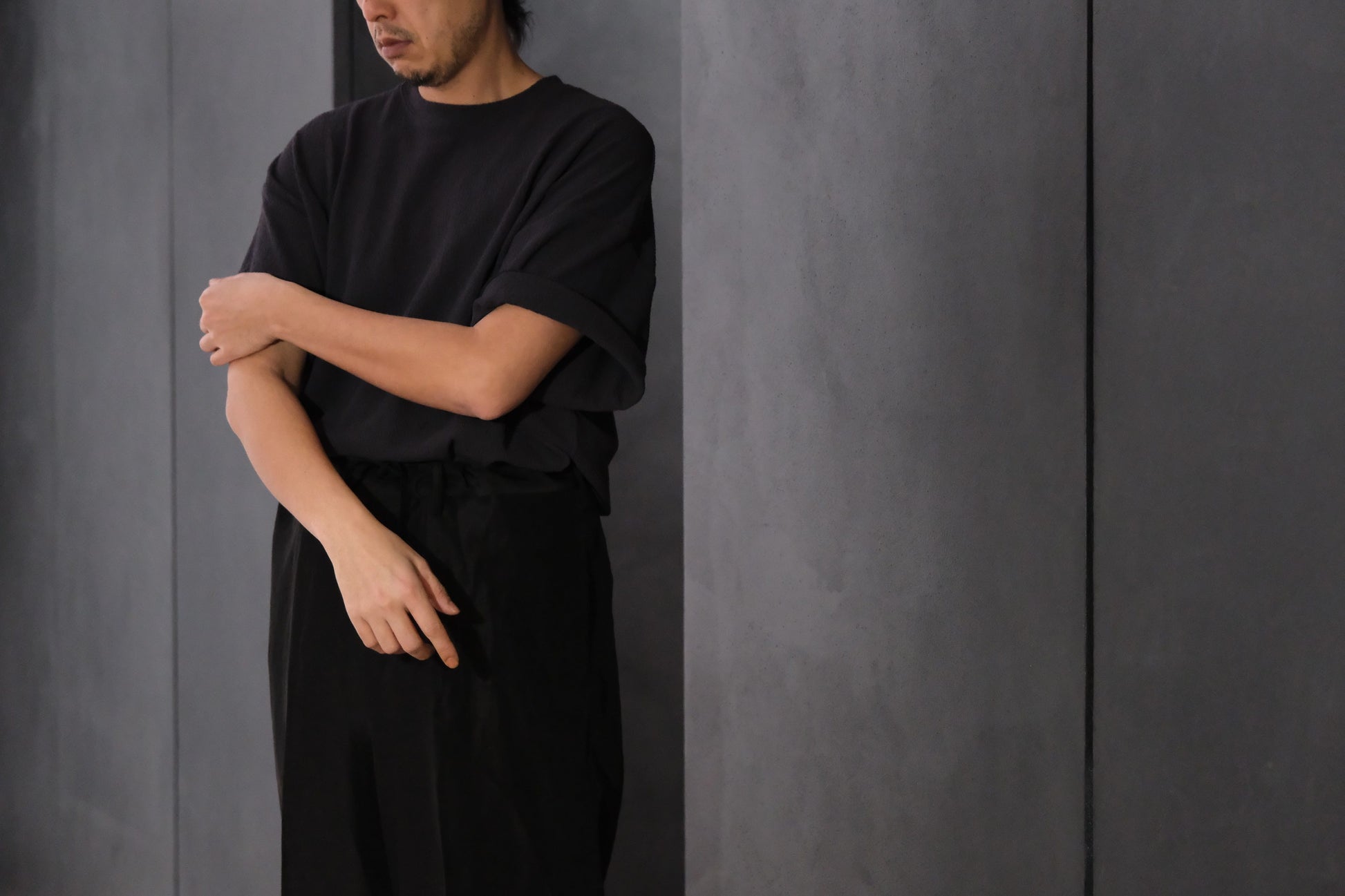 たっぷりとした身幅とドロップショルダーでリラックス感がありながらも、裾にかけてわずかにテーパードさせているので、だらしなく広がらず、きれいに収まる。