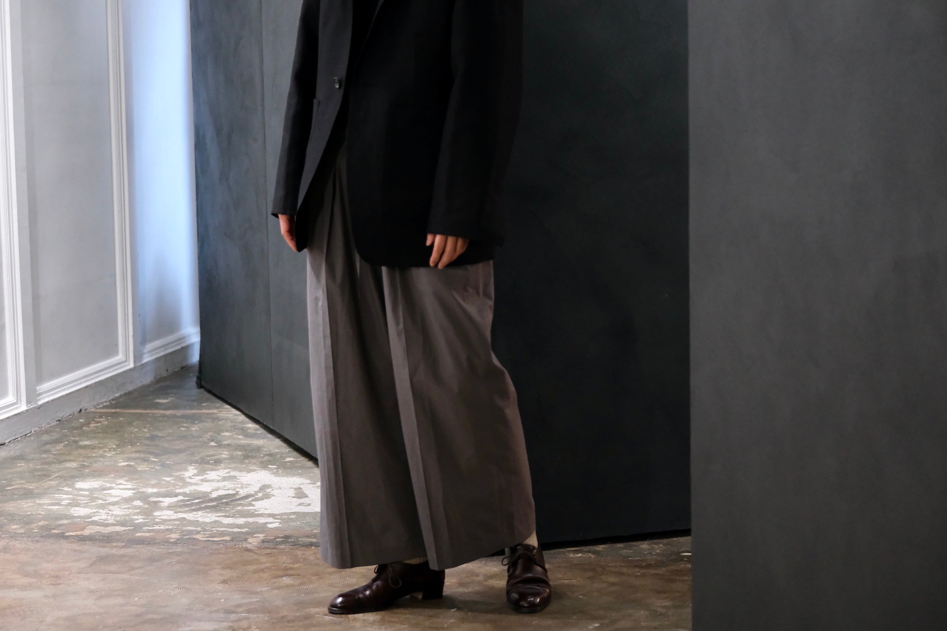 大胆な分量を持たせながらも、ただ太いだけではなく、生地の落ち感によって自然な縦のラインが生まれます。