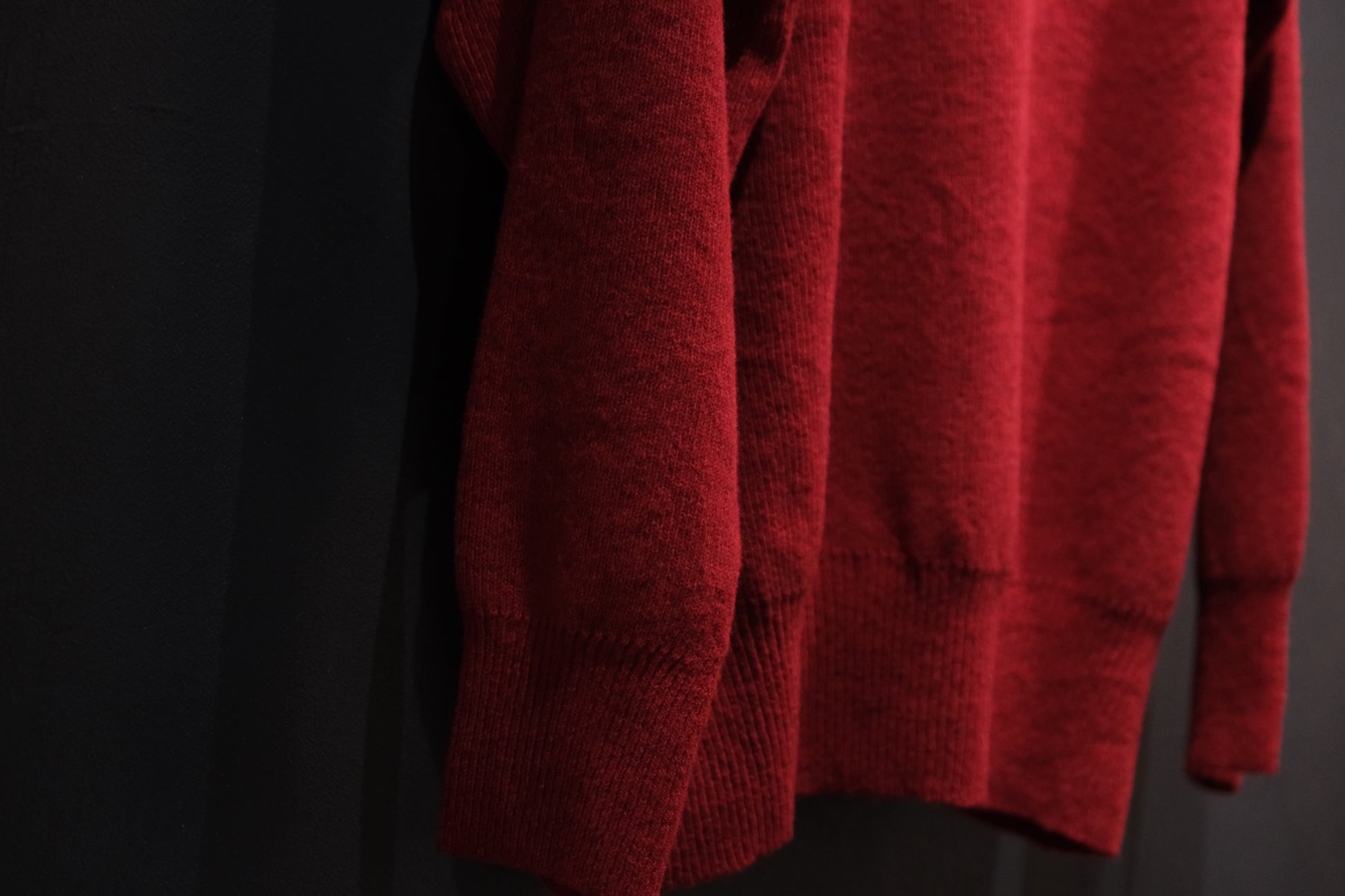 アウターインに着る防寒用として作られる軍物のセータ ーは、シルエットが細身で長いが、これはゆったり着ら れるサイズ感に仕上げている。