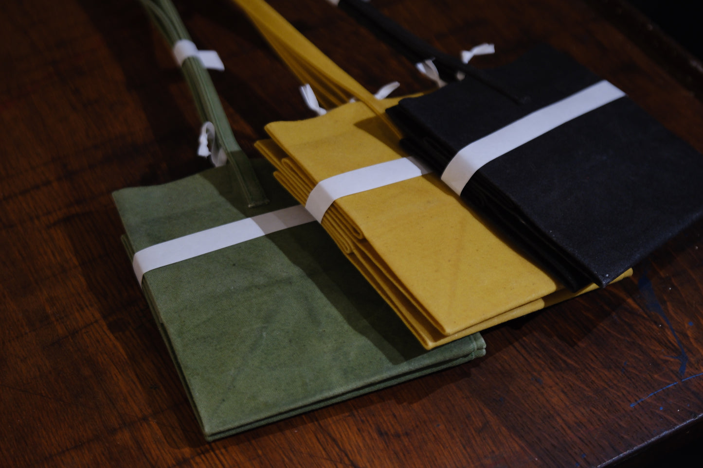 染色は特殊で、紙袋の質感を表現するために帆布にコーヒーと紅茶や鉄と烏龍茶など特別な配合で、独自の柔らかい色味を表しています。