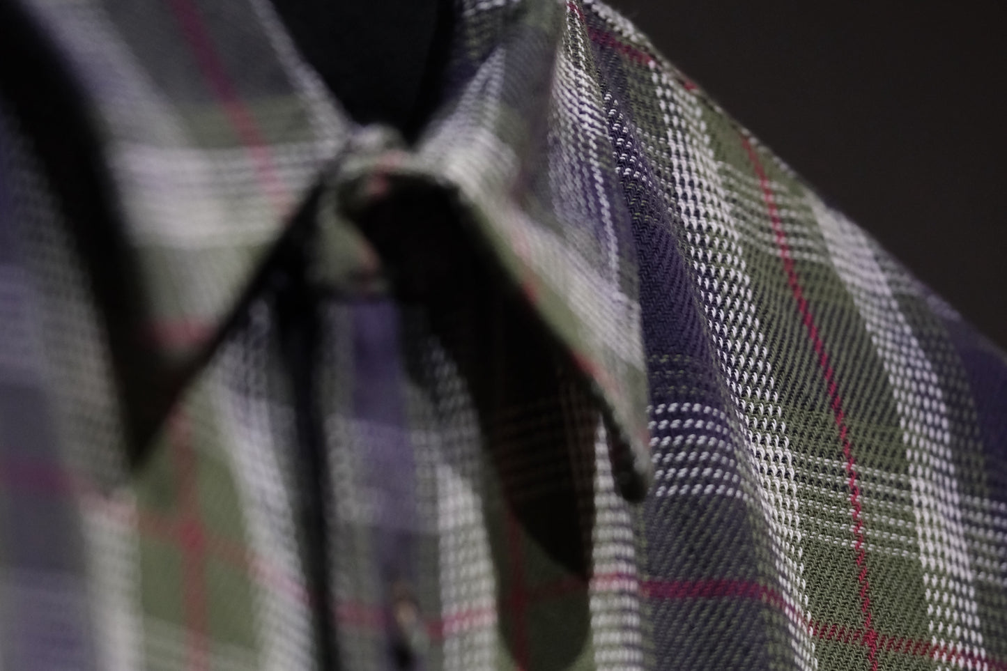 また、襟やカフスにはフラシ芯を使用し、着心地や風合いを大切にしています。全体的にスッキリとさせることで、カジュアルな雰囲気のチェックシャツを上品に仕立てています。