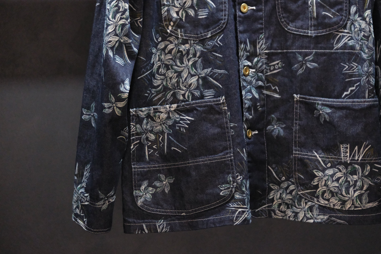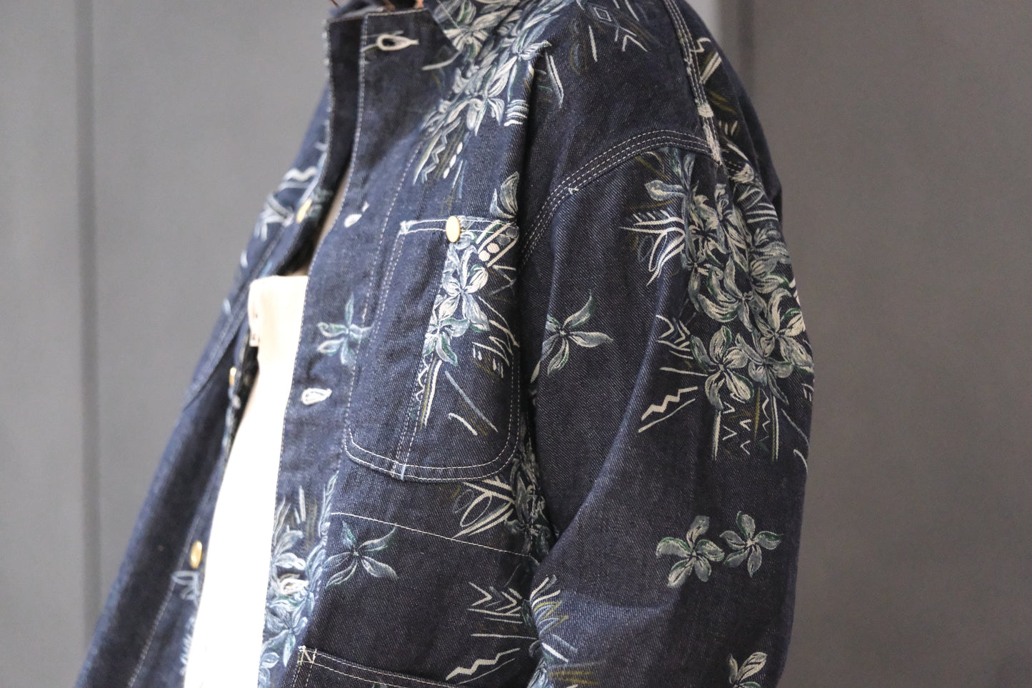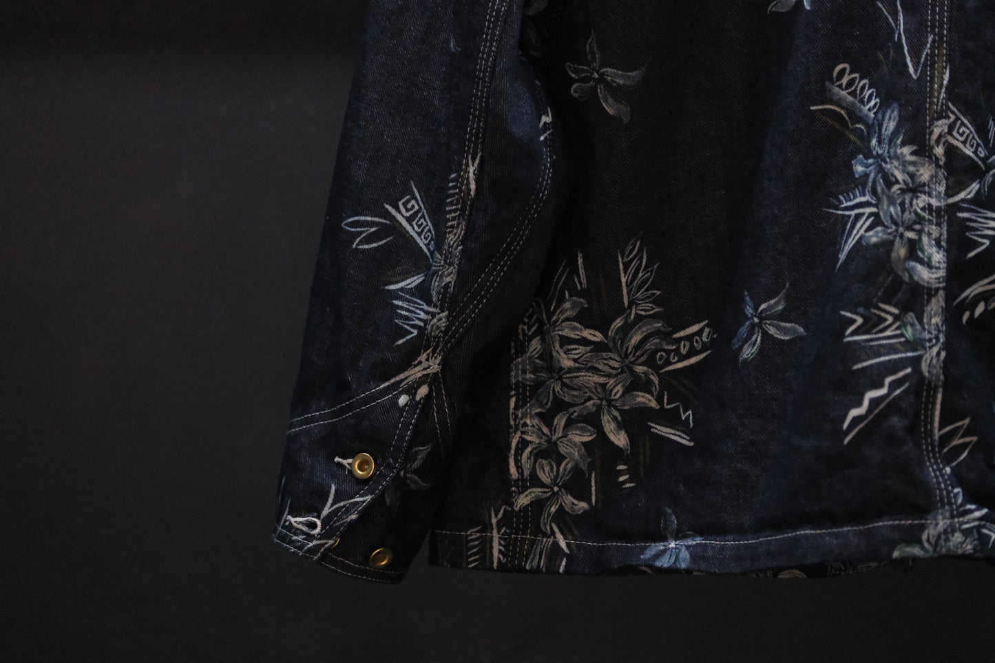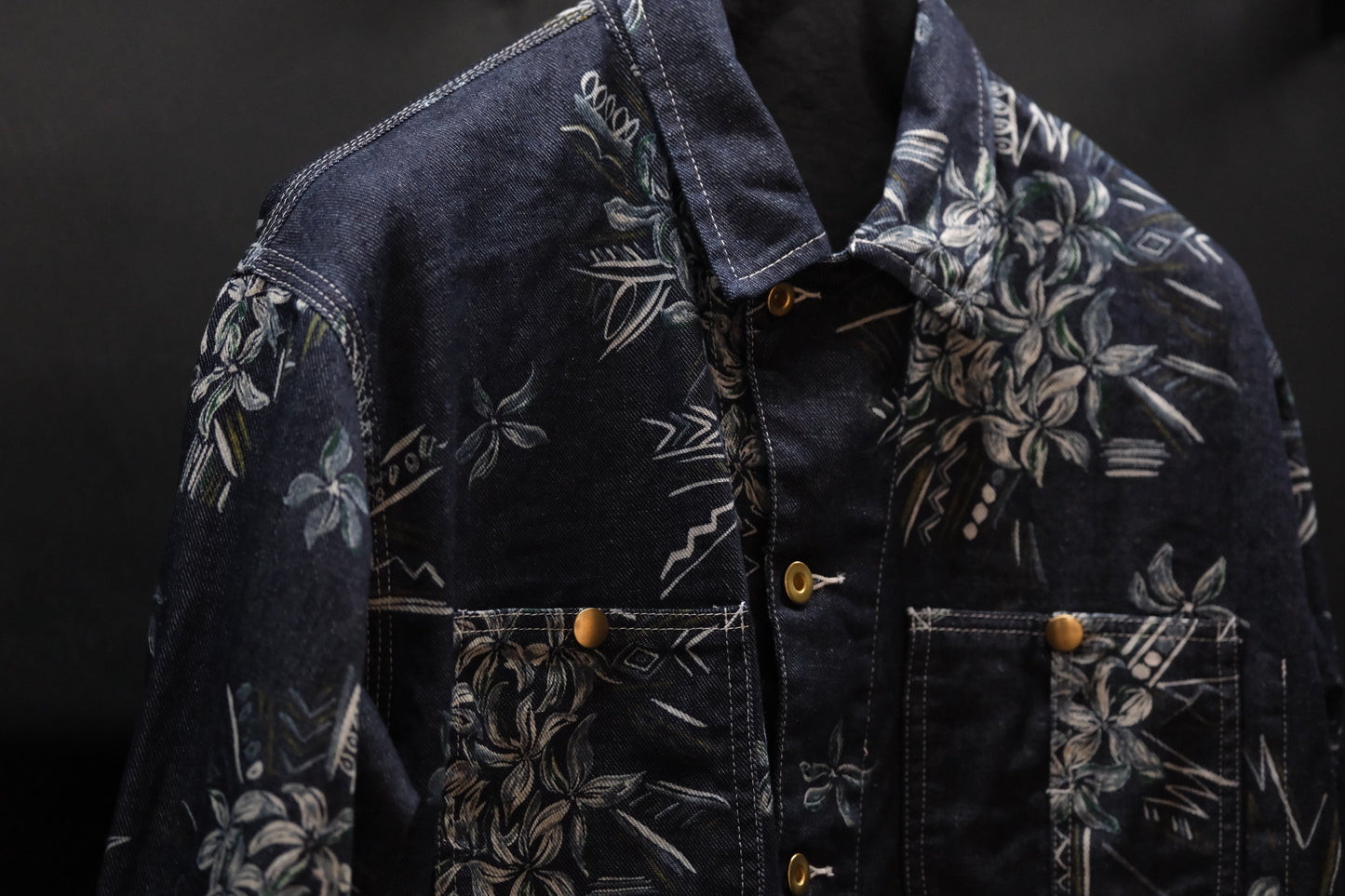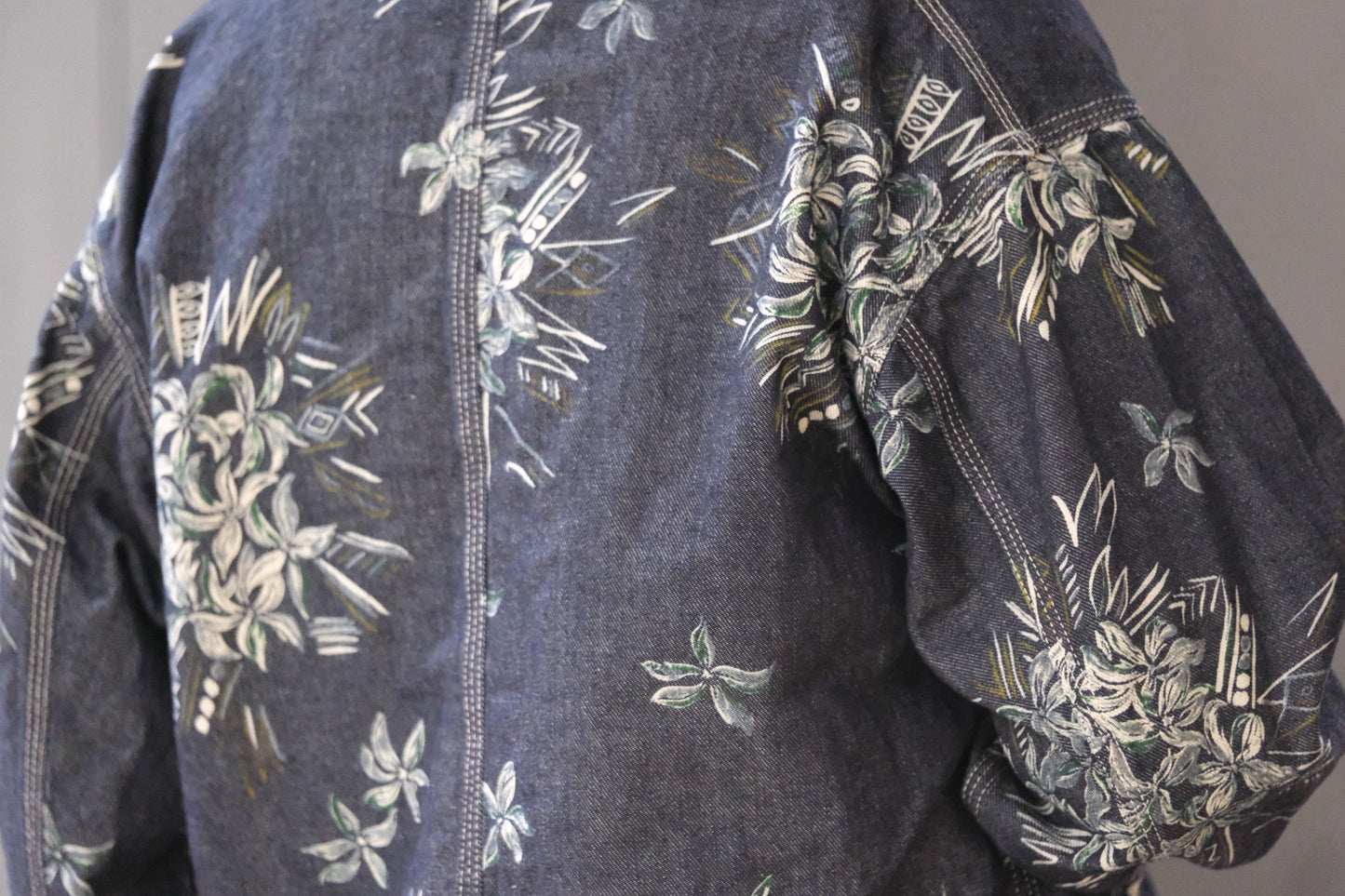 どこかレトロな雰囲気のある花柄をデニムにプリントいたしました。