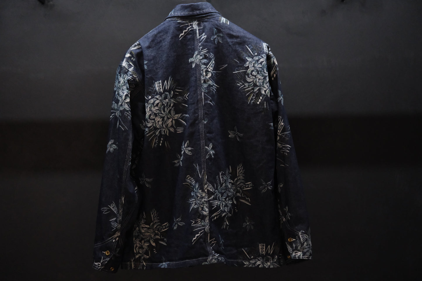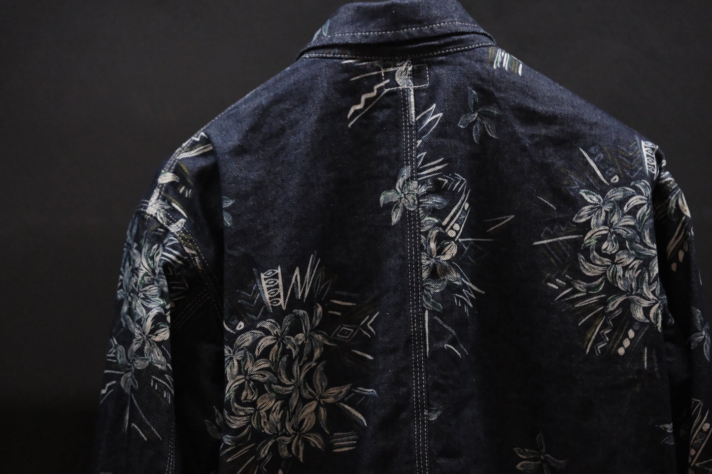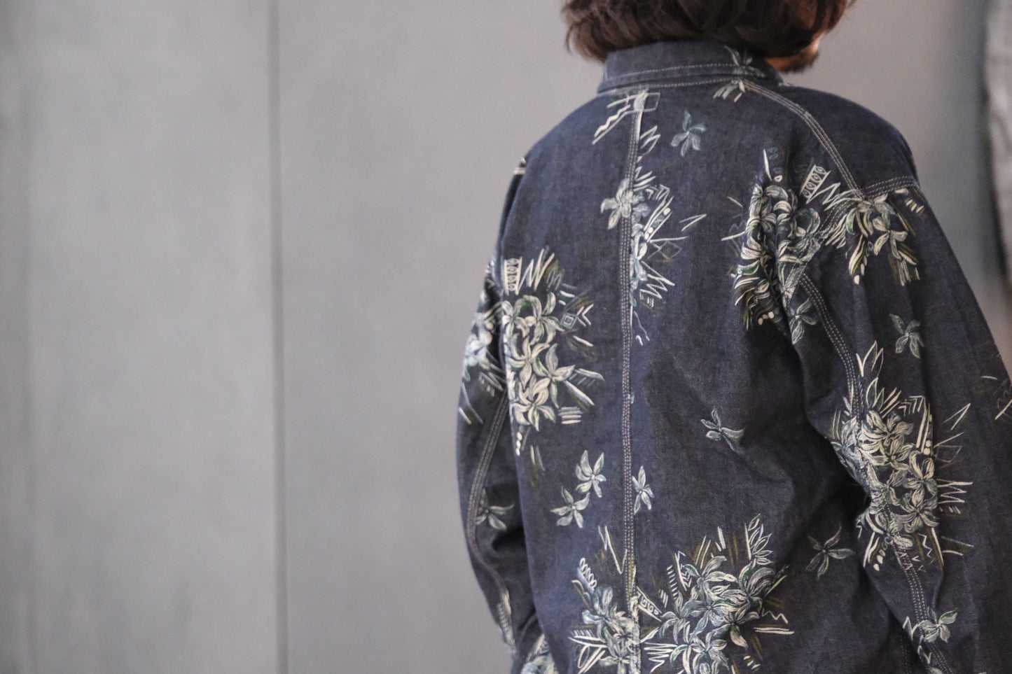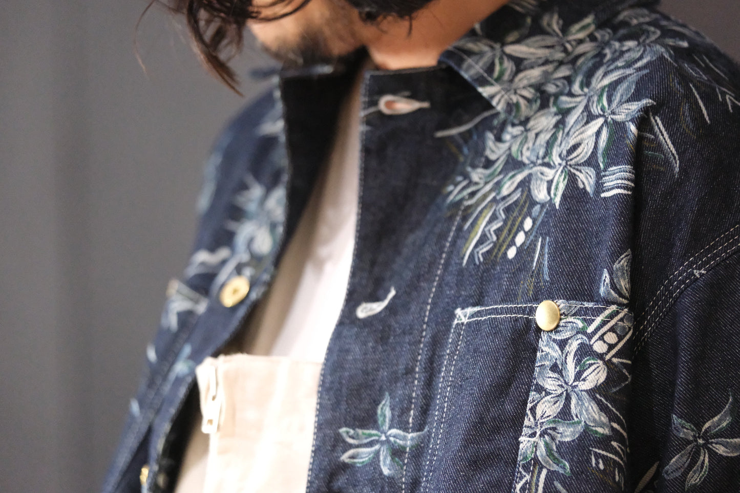 どこかレトロな雰囲気のある花柄をデニムにプリントいたしました。