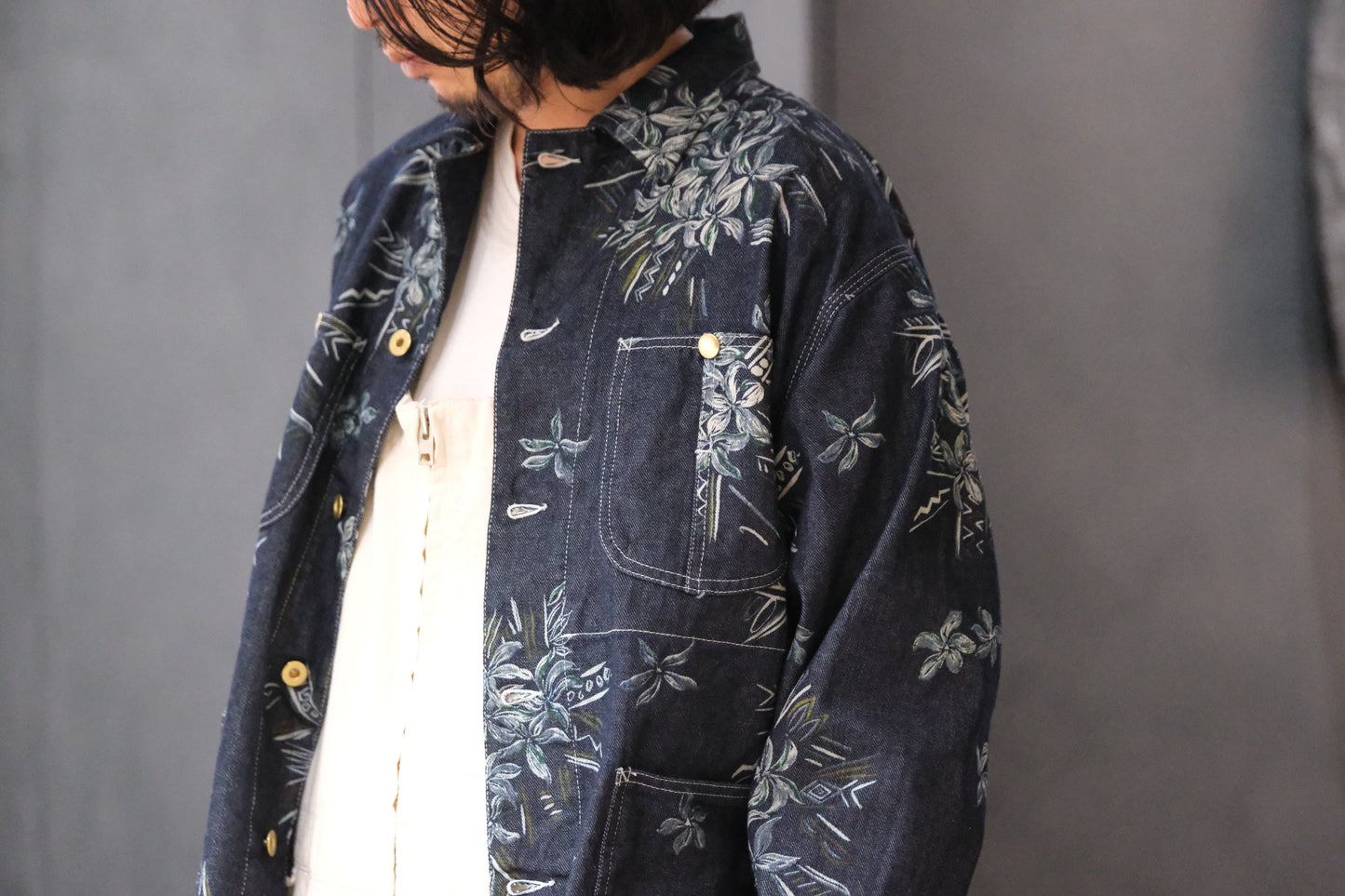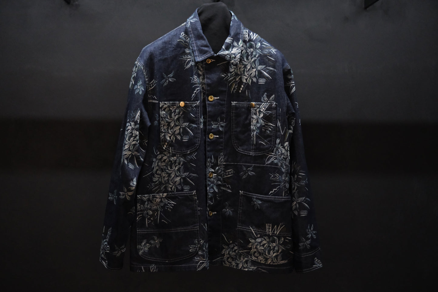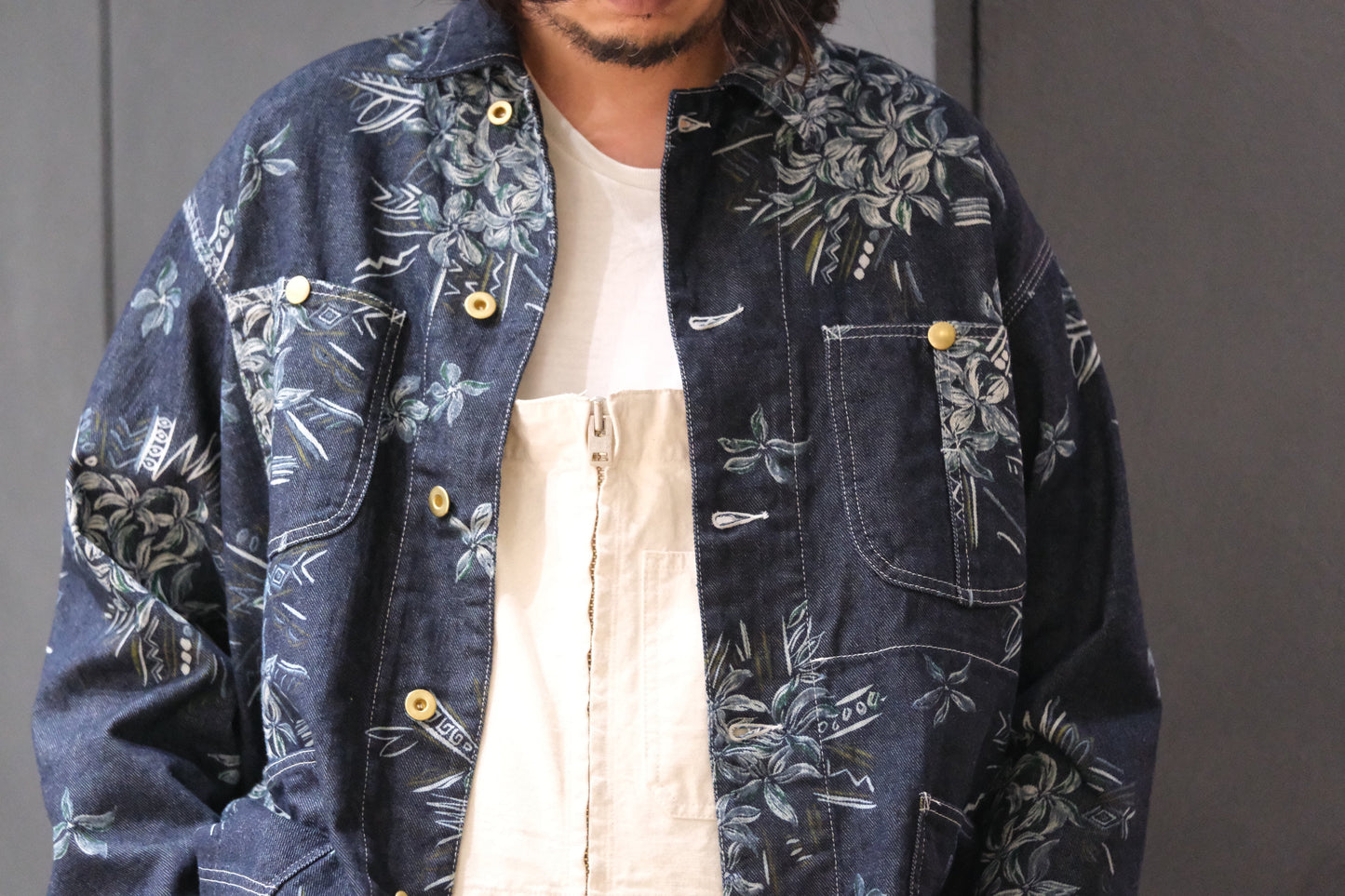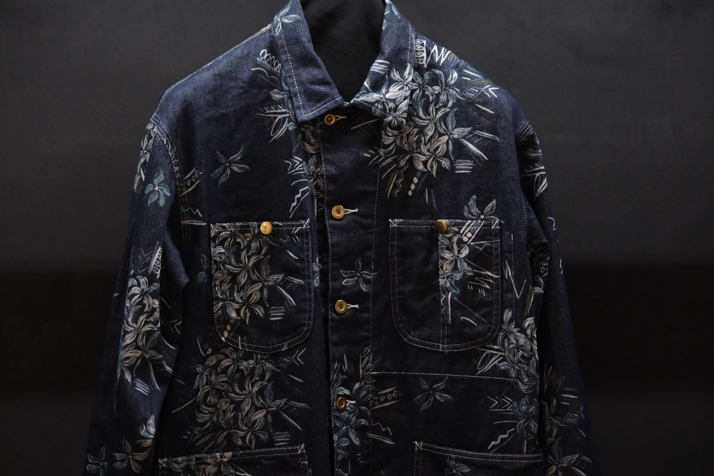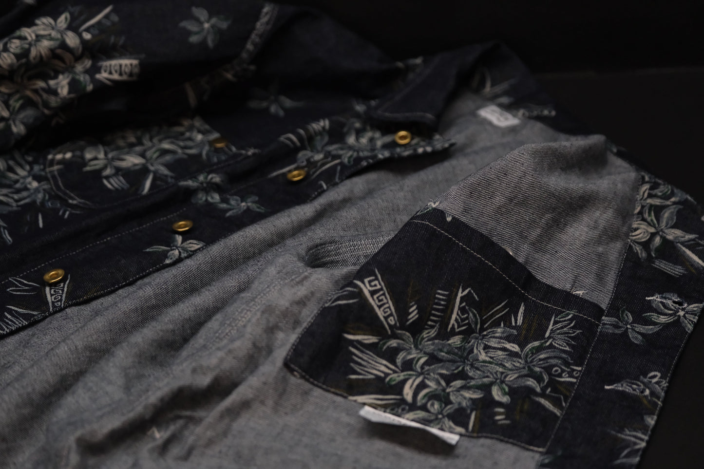 どこかレトロな雰囲気のある花柄をデニムにプリントいたしました。