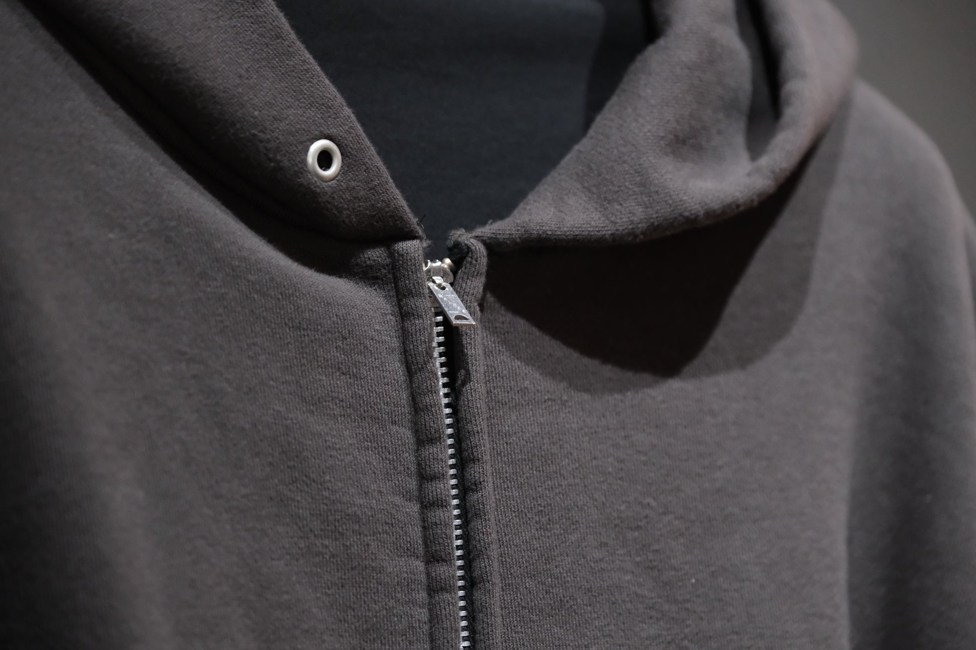 ジップはコットンテープ付きのアルミ製ファスナーを採用し、軽さとヴィンテージ感を両立。フードやアームホールは、あえてステッチを抑えたクラシックな表情に。フロントポケットもベーシックな仕様で、使いやすさを重視しています。